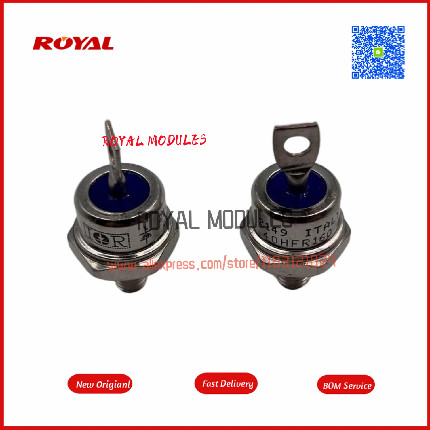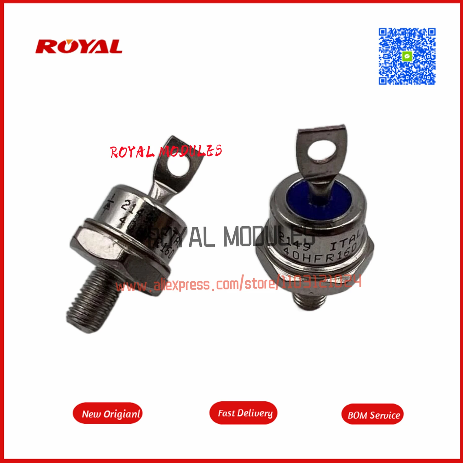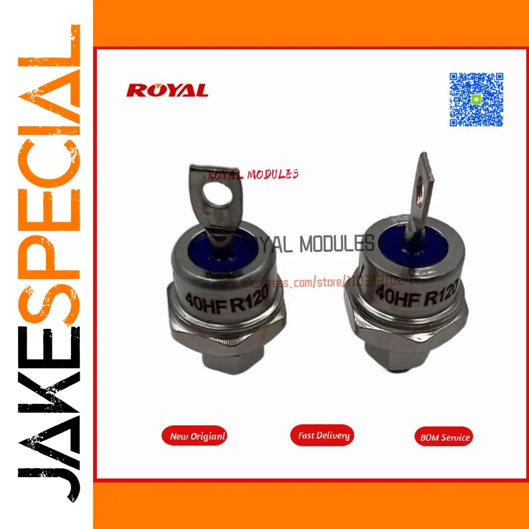 Experience reliable power management with this set of 10 high-quality modules, including models 40HF120, 40HF160, 40HF80, 40HF60, 40HF20, 40HFR120, 40HFR160, 40HFR80, 40HFR60, and 40HFR20. These new, customized modules feature a sleek, metallic cylindrical design with polished surfaces that reflect light for a modern, industrial look. The modules are equipped with hexagonal nuts at the base for secure mounting and top terminals—either a circular bolt hole or a flat tab for versatile connections. Color accents, such as a vibrant blue ring on some models, add visual distinction. Designed for high-current applications, they combine durability with precise technical performance.