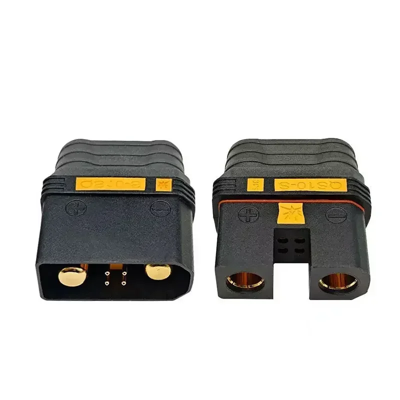 Experience seamless, reliable connections with this high-current QS10-S quick connector set, designed for demanding applications like electric vehicles, aircraft, UAVs, and forklifts. Crafted from durable black plastic or composite material, these connectors exude strength and security. The male connector features two striking, gold-plated copper cylindrical contacts that ensure optimal conductivity and corrosion resistance. Both the male and female connectors are accentuated by vibrant orange labels prominently displaying “QS10-S,” highlighting their modern industrial look. With a rugged, rectangular design and rubber or silicone protective caps, these connectors provide environmental protection against dust and moisture. They’re perfect for high-power systems where safety, durability, and precision are critical, offering easy, fast, and secure disconnection even in challenging environments.