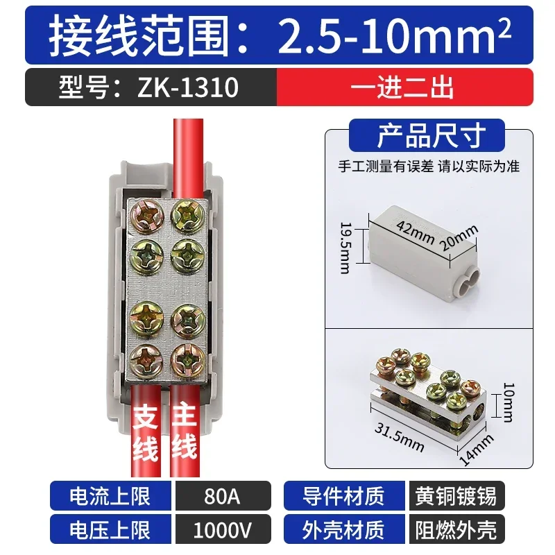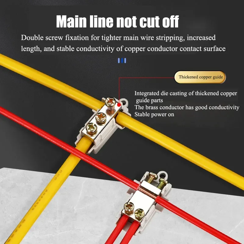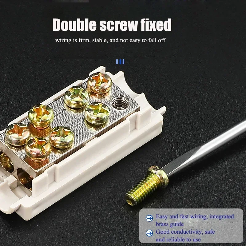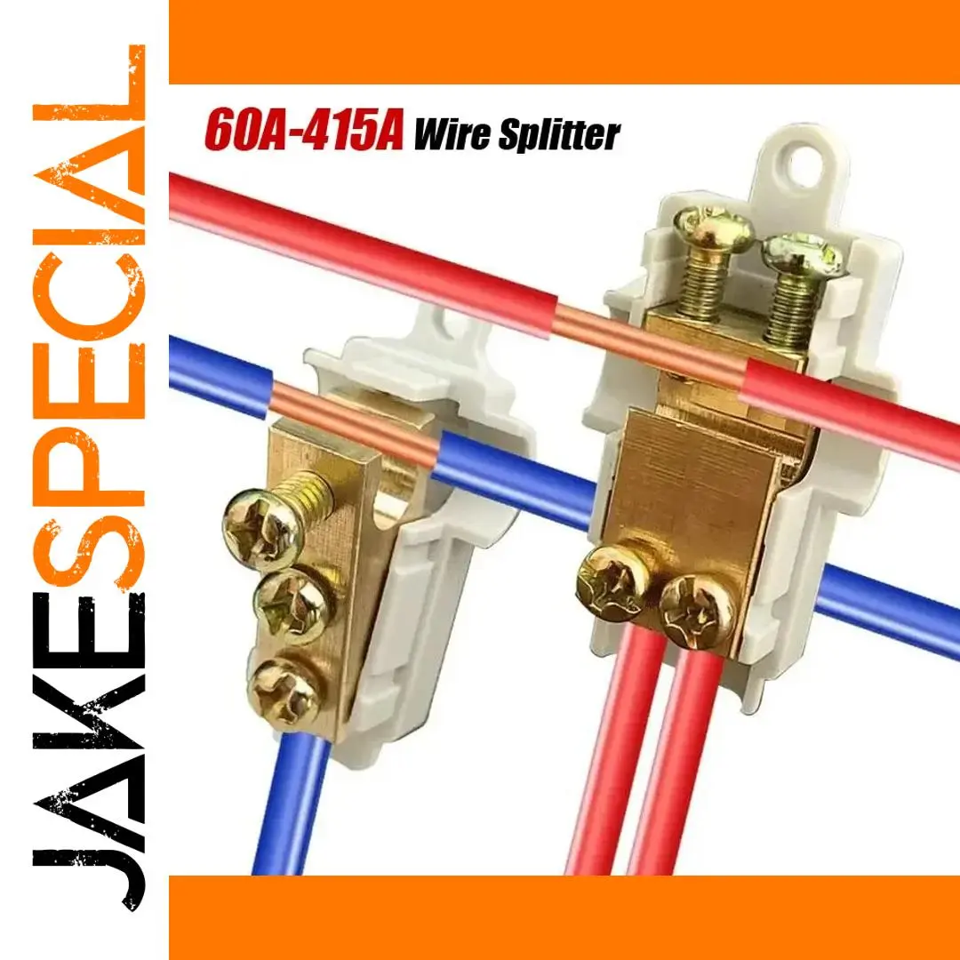 Experience reliable high-power connections with this T-shaped terminal block clamp wire splitter, supporting currents from 60A to 415A. Crafted from durable, tinned brass for excellent conductivity, it features a flame-retardant PA shell ensuring safety in demanding applications. Designed for crimp wiring with European wiring standards, this non-break cable branch plug offers a robust and compact solution for high-current electrical setups, enhancing safety and efficiency in industrial environments. Its sleek, precise design with polished metallic screws and vibrant wiring options makes it an essential tool for professional electrical installations requiring durable, high-performance connectors.