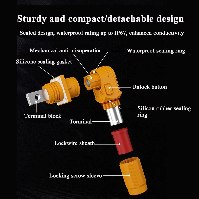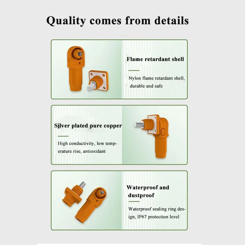 Experience reliable energy transfer with this waterproof IP67-rated energy storage connector designed for industrial and energy storage applications. Capable of handling up to 120A current and supporting a maximum voltage of 1000V, this connector features a durable PA66 nylon shell with ventilation-like slots for heat dissipation, and a silver-plated T2Y pure copper terminal for excellent conductivity and corrosion resistance. Its screw-type installation ensures a secure connection, and the robust construction allows for over 500 plug/unplug cycles, making it perfect for outdoor, high-current environments. Trusted for durability, safety, and high performance, this connector is ideal for energy storage cabinets and industrial systems.