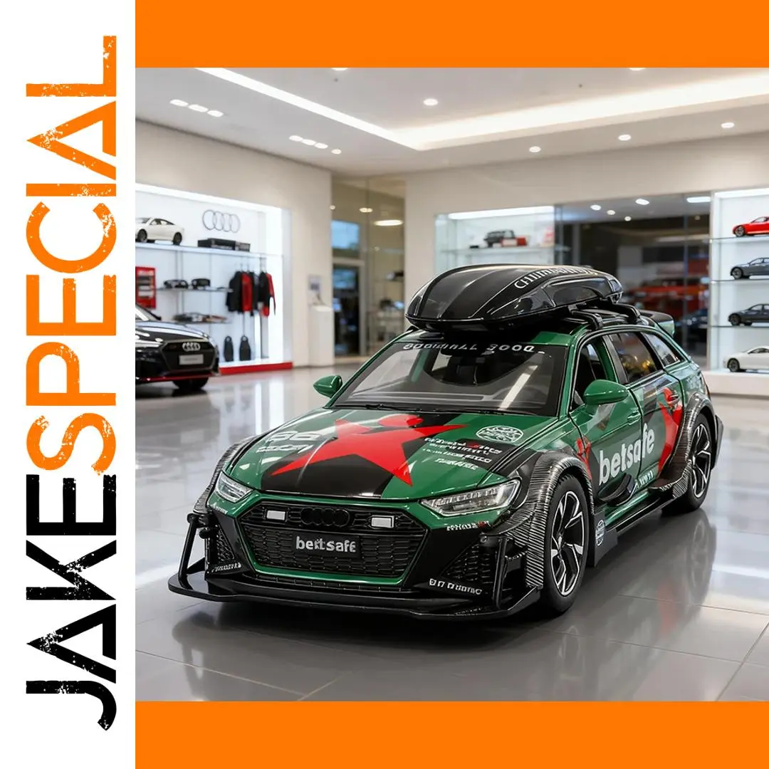 Experience the thrill of racing with this meticulously crafted 1:32 scale diecast model of a modified RS6 DTM vehicle. Made from alloy and plastic, it features a vibrant green finish accented with bold graphics and a prominent red star on the hood and sides. The vehicle’s aerodynamic design includes detailed elements such as a large front grille, splitter, and side vents, capturing the essence of a high-performance racing car. The black multi-spoke wheels with rubber tires, transparent windows, and a sleek roof-mounted cargo box highlight its sporty appeal. This collectible is ideal for display, reflecting precision craftsmanship and dynamic aesthetics that will impress any enthusiast or collector.