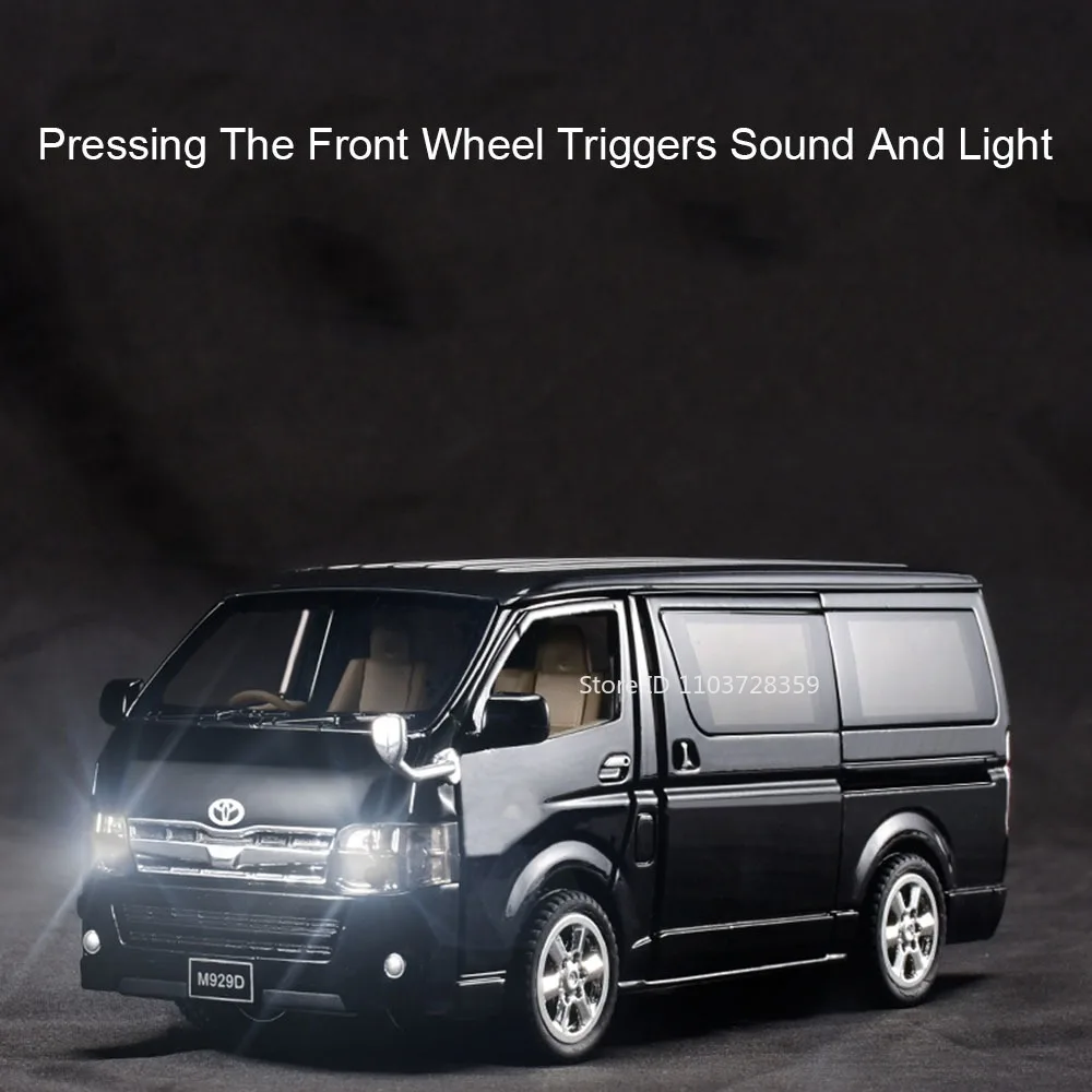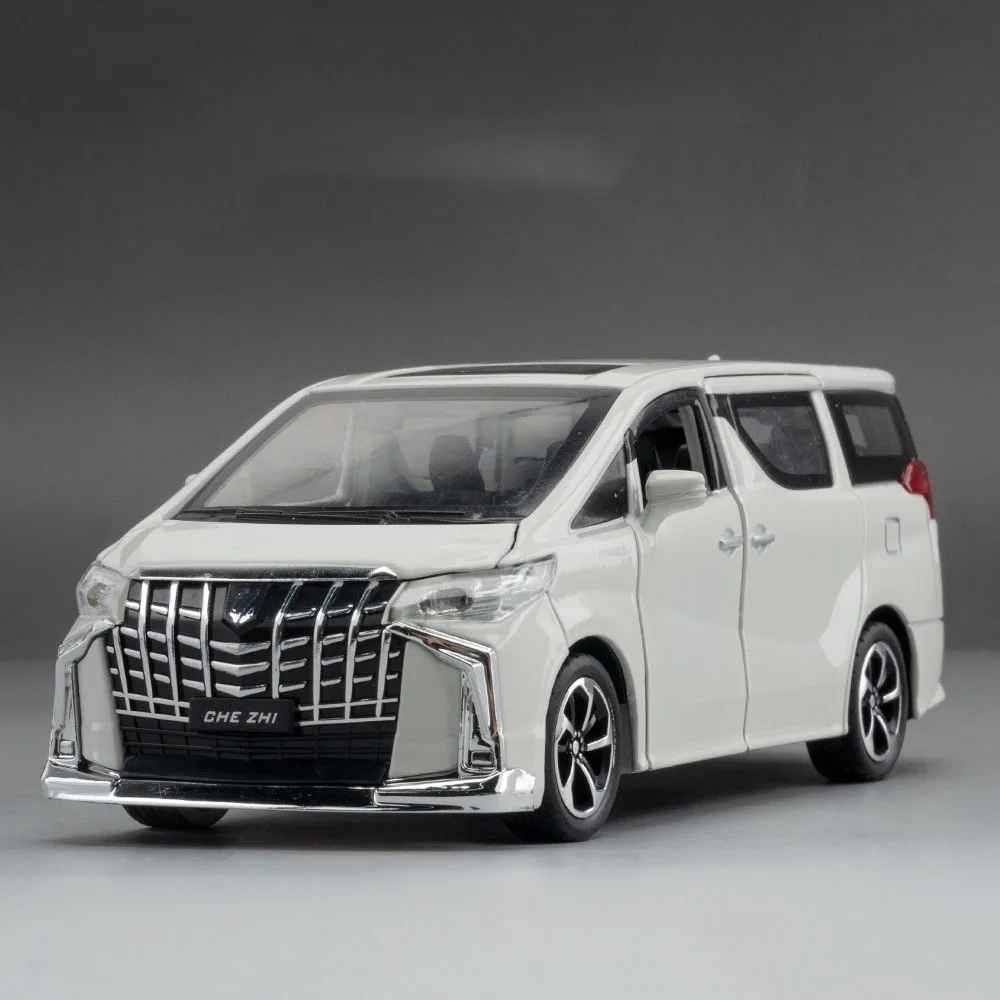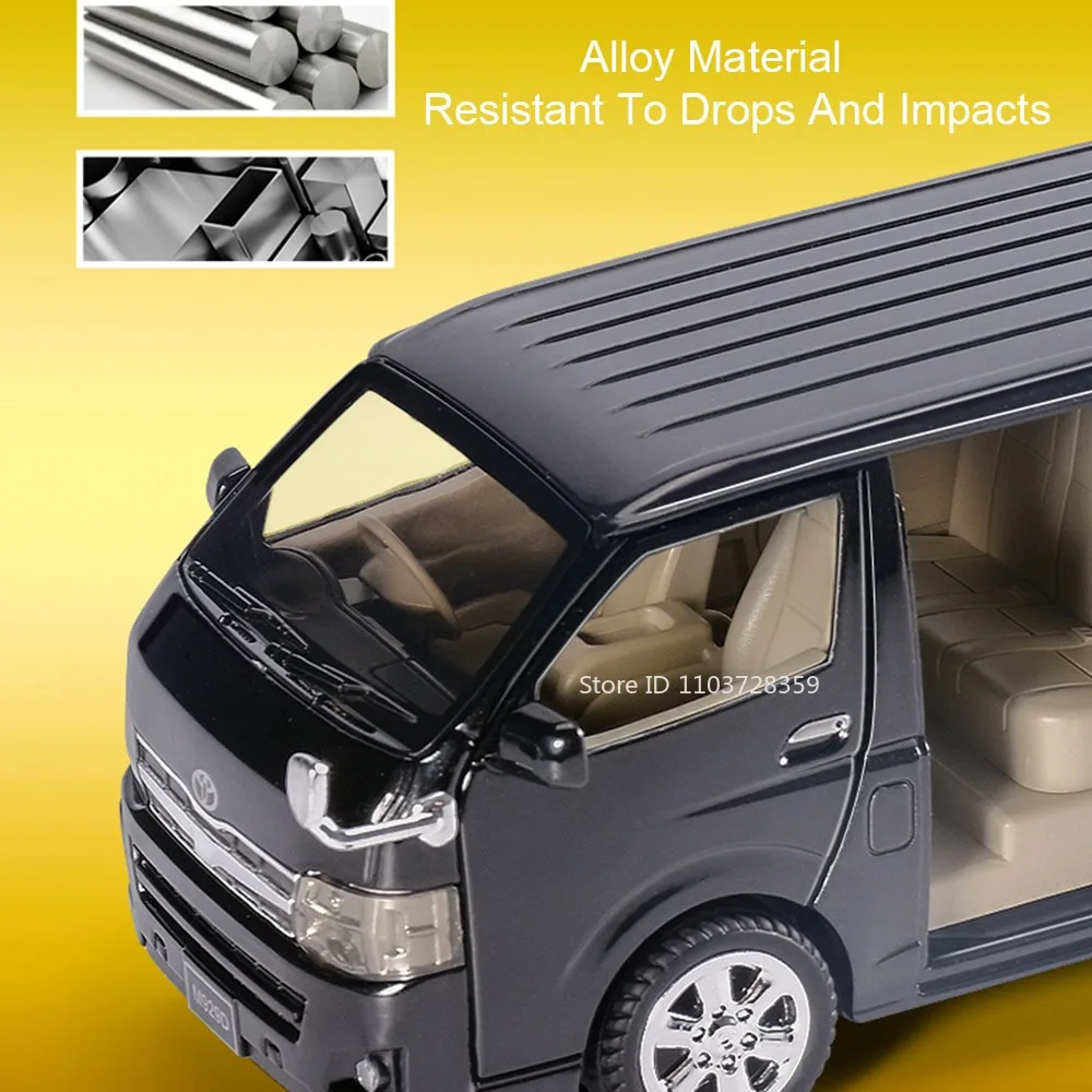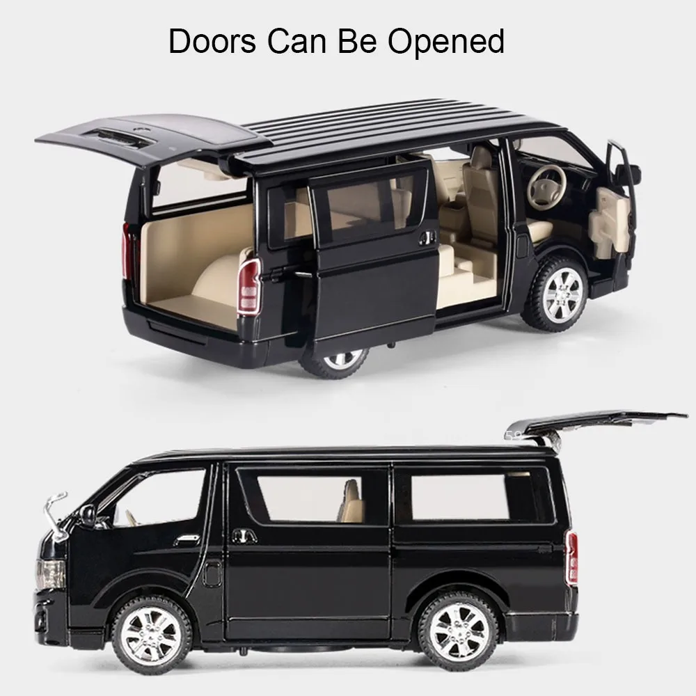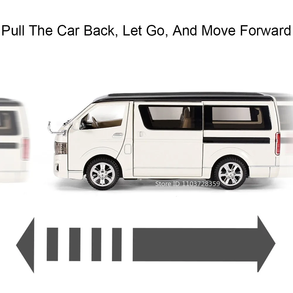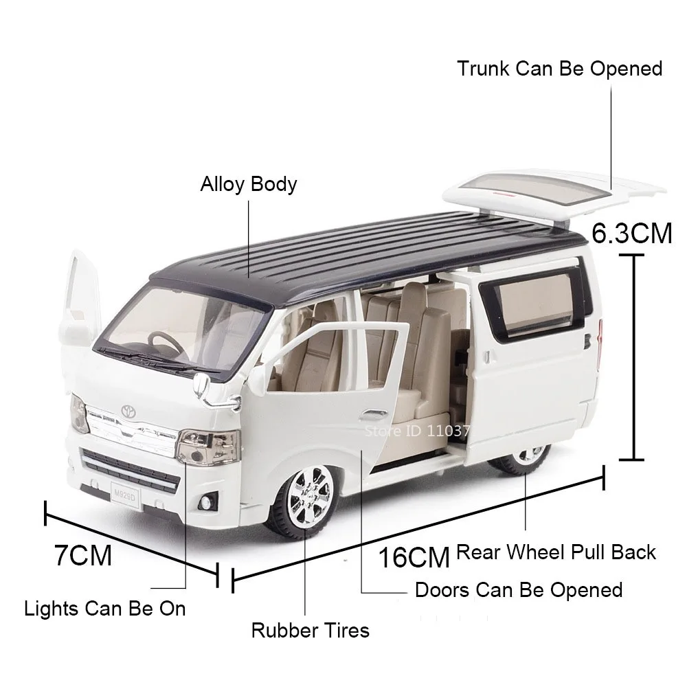 - Meticulously designed 1:32 scale model with a shiny white metallic finish, capturing the sleek and modern style of real Toyota Hiace MPV. Ideal for display or active play.