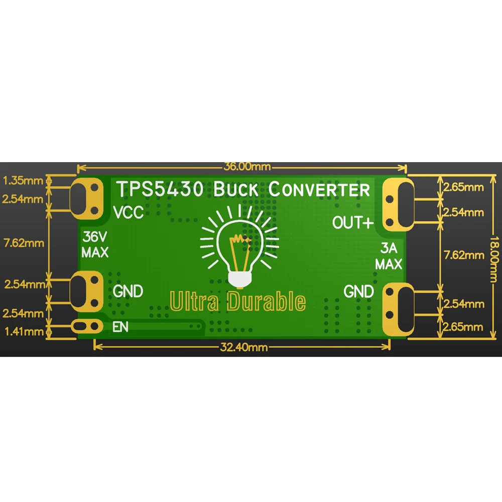 This compact DC-DC buck converter module features a 36mm x 18mm x 10mm green PCB with a sleek industrial aesthetic. It supports input voltages from 5.5V to 36V and delivers adjustable output voltages of 3.3V, 5V, and 12V with up to 3A current capacity. Achieving a maximum efficiency of 95% at a switching frequency of 500MHz, it combines high-performance power regulation with a sturdy, precisely engineered design. The module supports multiple installation methods including SMD, plug-in, and lead welding, and includes a controllable shutdown function via the enable pin. Its high integration and quality components make it ideal for reliable voltage regulation in demanding projects.