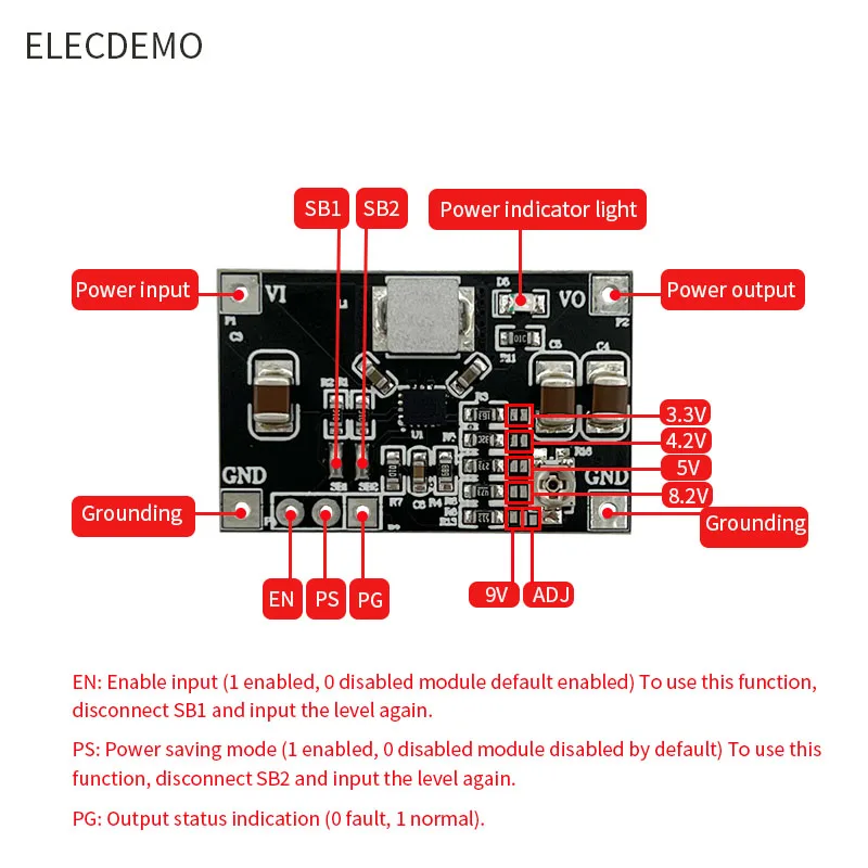 Experience reliable power management with this compact, high-efficiency TPS63070 buck-boost module, measuring 29mm x 18.5mm. Supporting input voltages from 2V to 16V and providing up to 2A of output current with an efficiency of 95%, it features an adjustable output voltage from 2.5V to 9V, with options including 3.3V, 4.2V, 5V, 8.2V, and 9V via a jumper. Designed for versatile applications such as lithium-ion devices, digital cameras, laptops, and medical products, it boasts a fixed 2.4MHz operating frequency, a static current under 50μA in energy-saving mode, and user-friendly functions like enable, power saving, and output status indication.