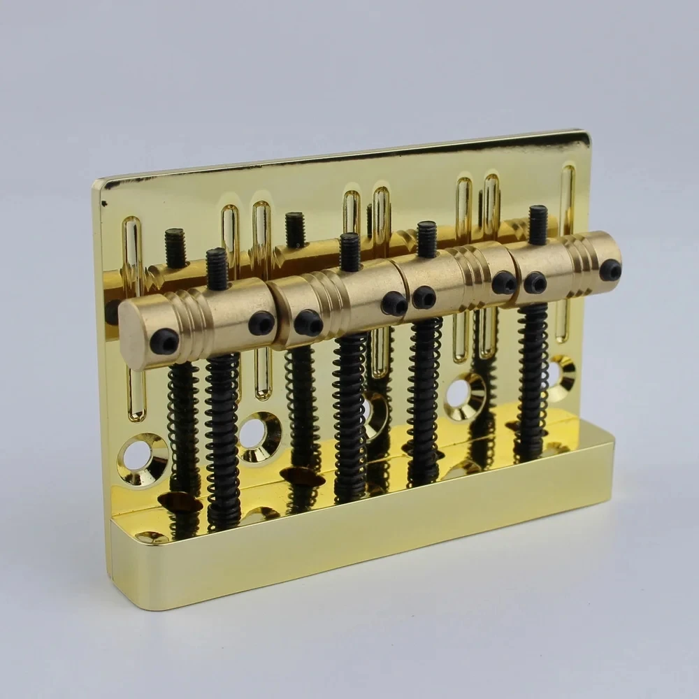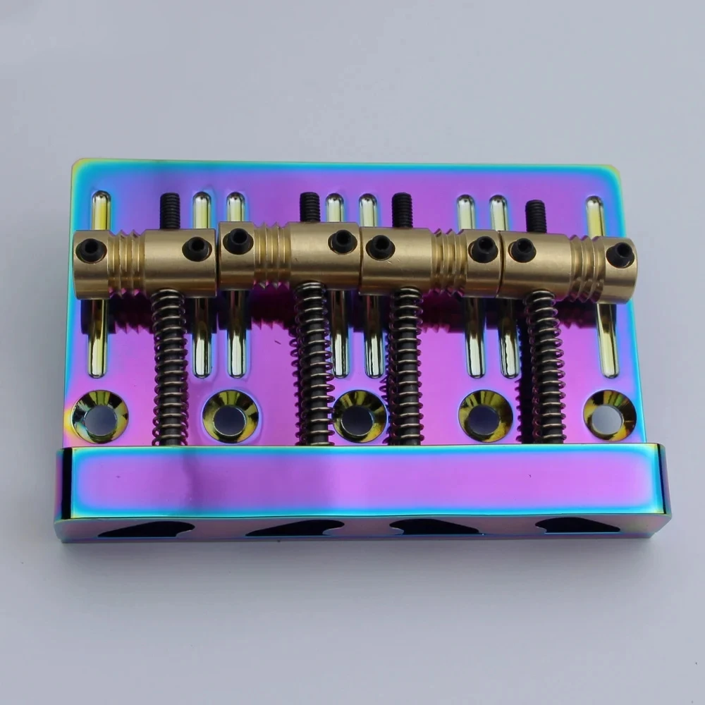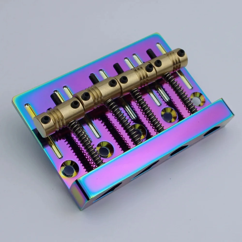 Experience the perfect blend of functionality and style with this high-quality 4-string bass bridge. Designed with a vintage CNC mechanical aesthetic, it features a highly polished, reflective chrome finish that adds a modern touch, or choose the elegant gold for a warmer vintage look, or iridescent for a unique shimmer. Made from durable metal components, including a zinc alloy base and brass saddles, this bridge guarantees longevity and reliable performance. Its smooth, rectangular profile with rounded edges offers a sleek silhouette that complements any bass guitar. The thoughtful design, with features like 19mm string spacing and grooved cylindrical sections, ensures precise intonation and stability. Whether you're upgrading or customizing your instrument, this versatile bridge elevates both sound and appearance.