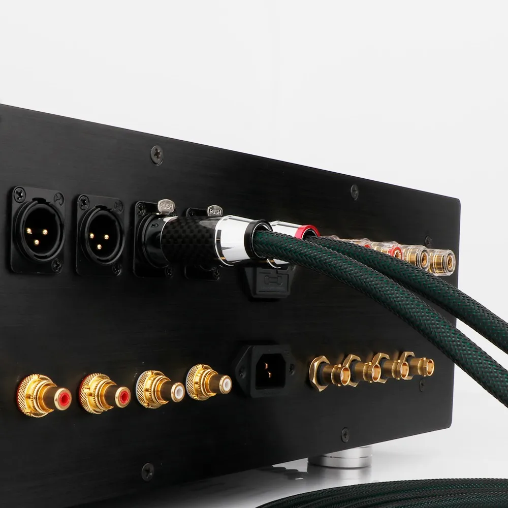- Features gold-plated RCA connectors and either male or female XLR connectors with a silver finish, reinforced with carbon fiber sleeves for durability and a premium aesthetic.