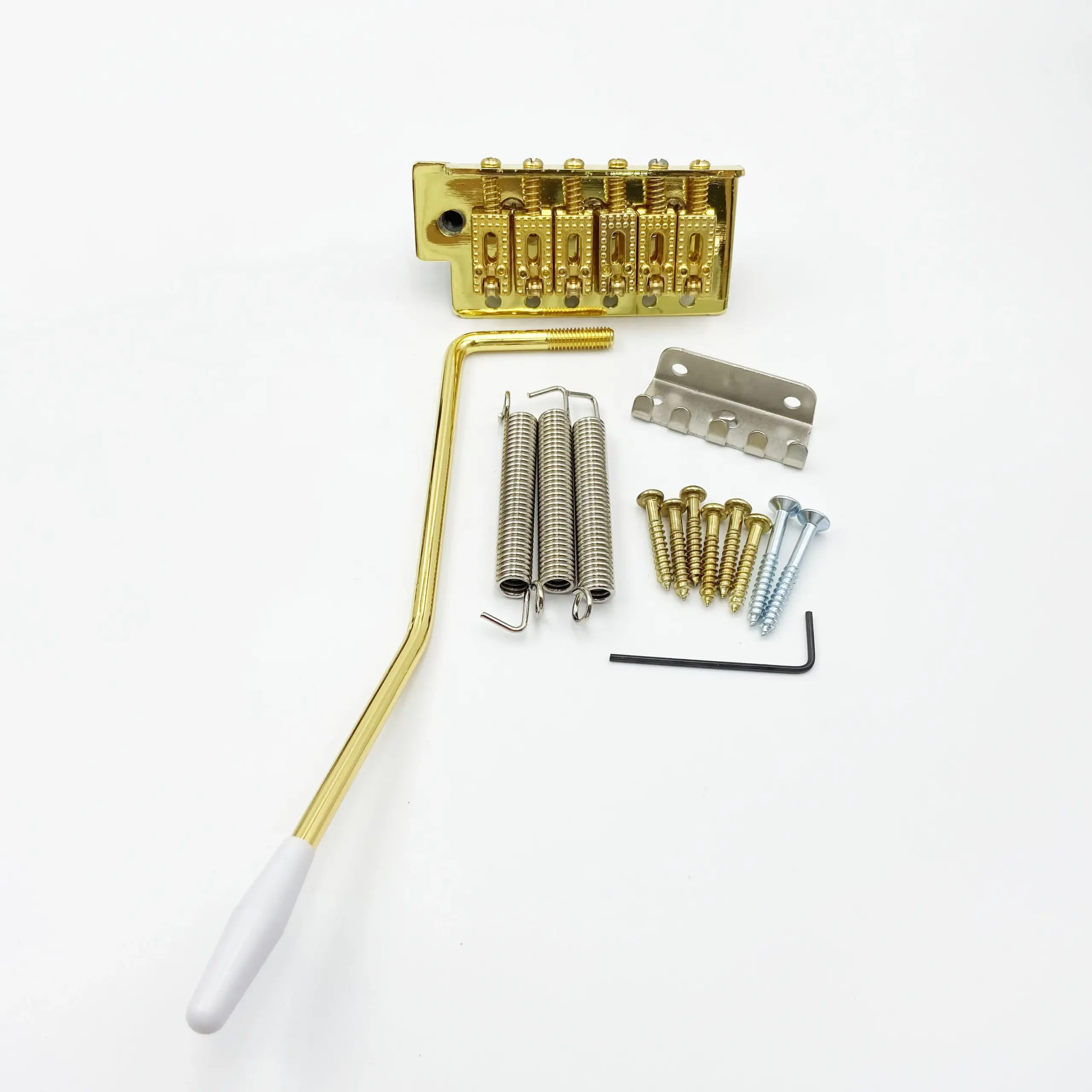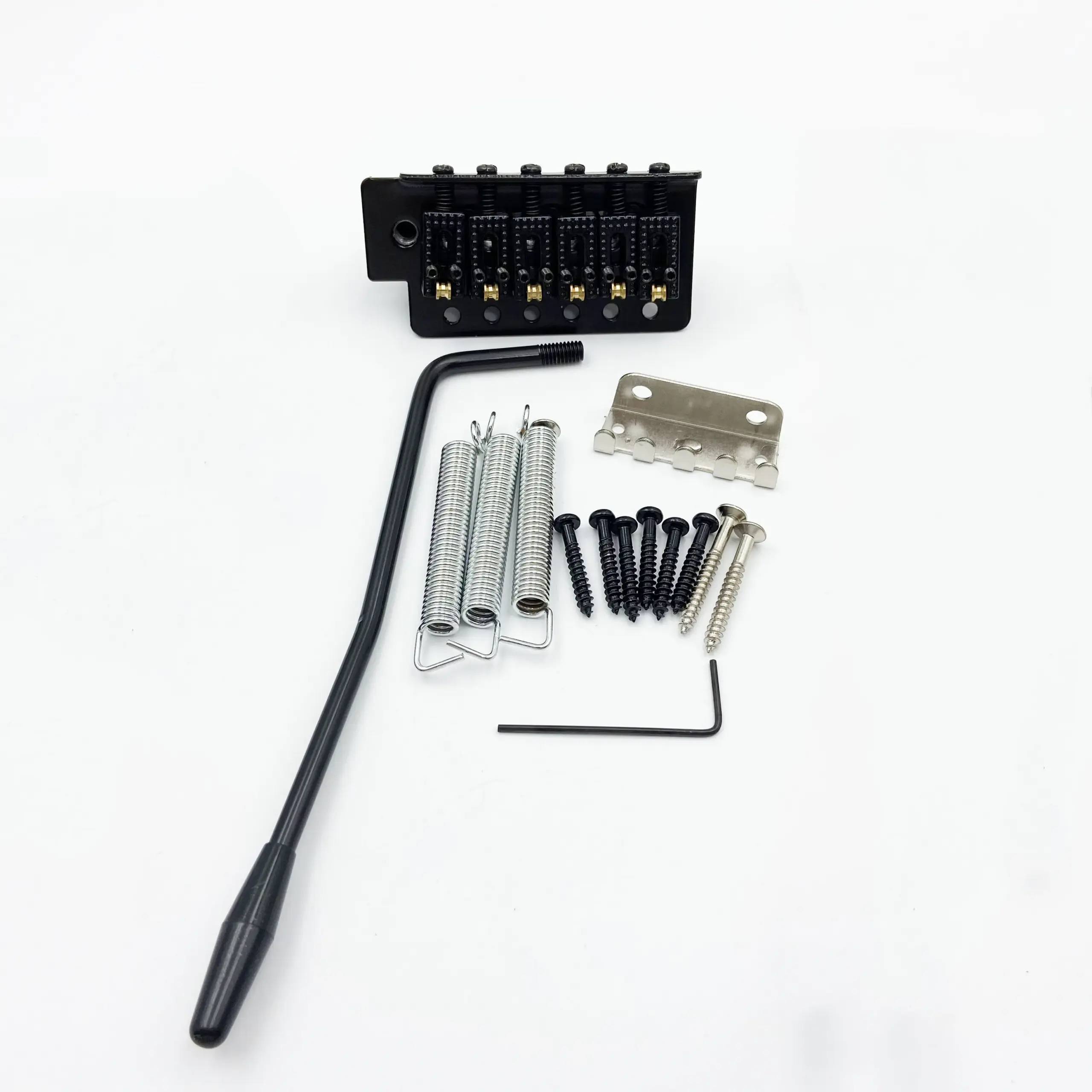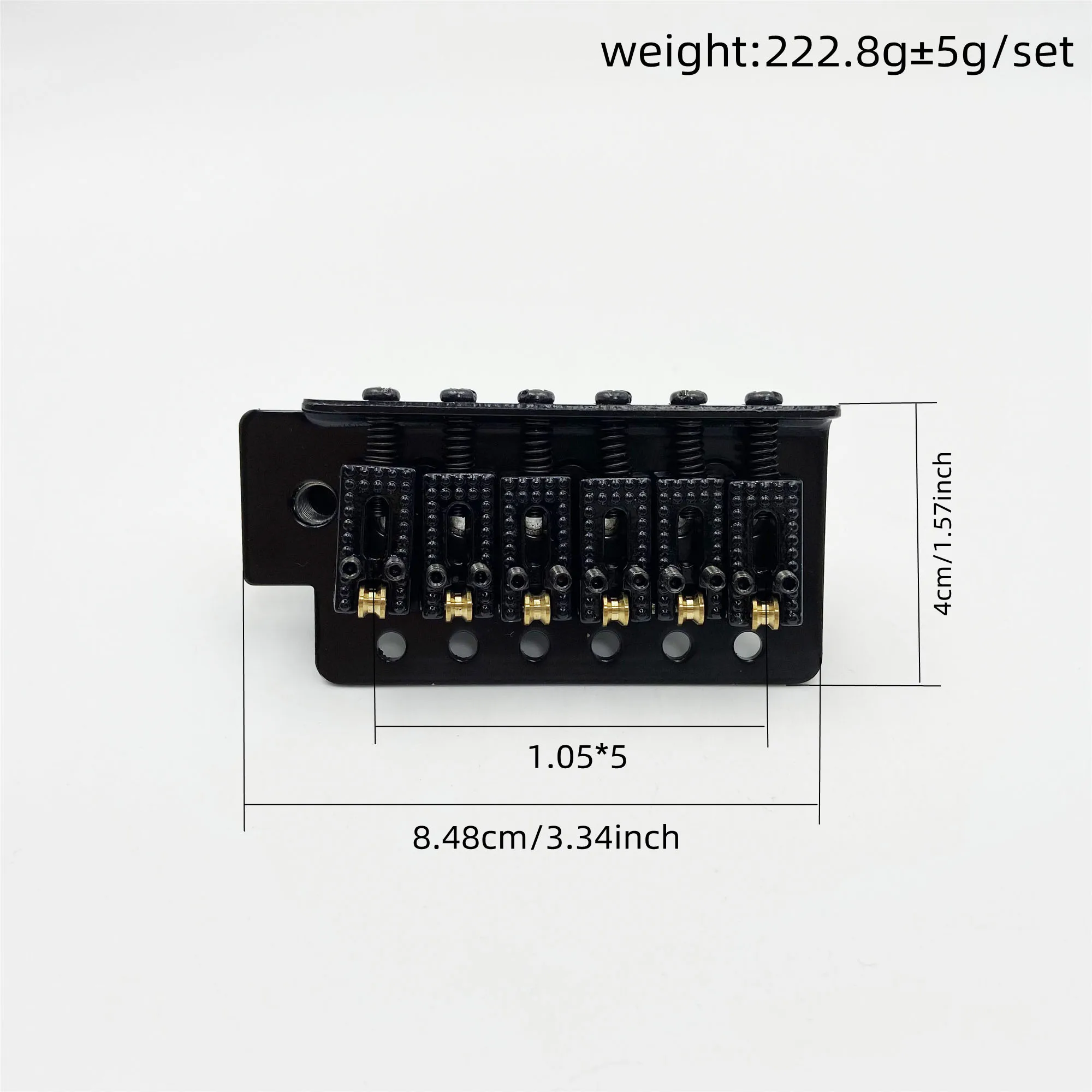 Experience superior sound and sleek aesthetics with this high-end ST Ball Code single-crank guitar bridge. Crafted from durable zinc alloy, it features a polished, black electrophoretic finish complemented by six gold-colored saddles for striking contrast. The set’s intricate design includes three tension springs, a black joystick tremolo arm, and precision adjustment screws, all assembled to optimize tuning stability and pitch control. The entire set weighs around 273 grams in gold and silver finishes, or 222.8 grams in black, emphasizing its lightweight yet sturdy construction. Whether you're upgrading your current guitar or building a custom instrument, this bridge seamlessly combines style, durability, and precision, providing the perfect foundation for your musical expression and ensuring a polished, professional performance every time.