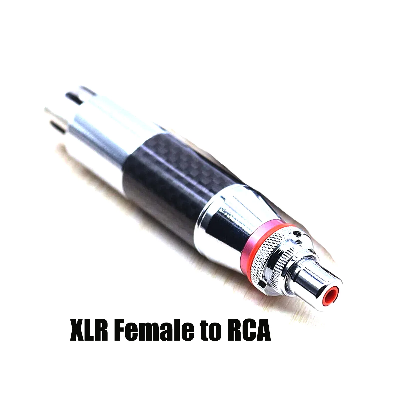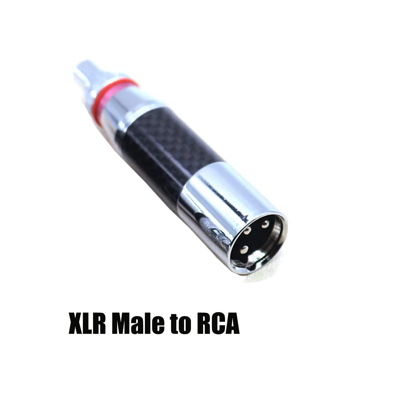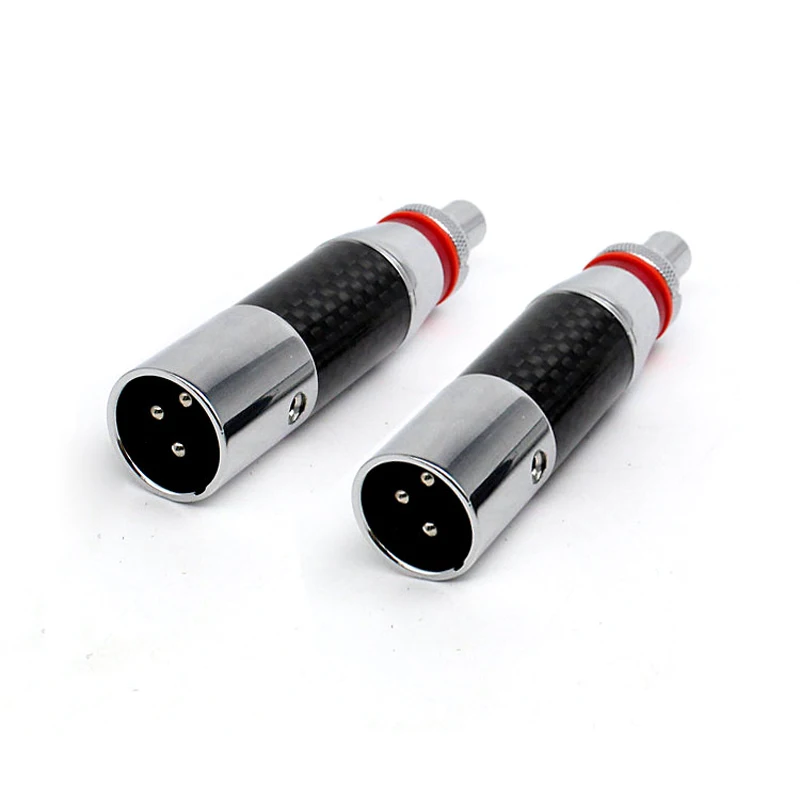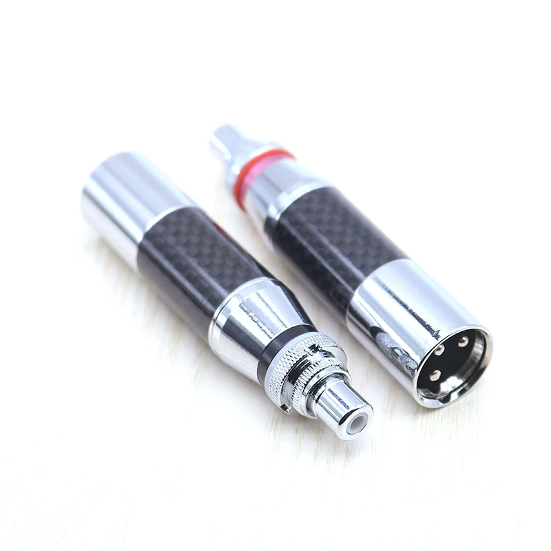 Experience premium audio connectivity with this high-end XLR to RCA connector adapter, featuring rhodium-plated RCA male and XLR male/female sockets with a 3-pin configuration in red and black. Crafted from durable carbon fiber and copper, with silver-plated conductors for optimal signal transfer, it seamlessly connects microphones, mixers, speakers, monitors, and amplifiers for audio and video applications. Its sleek design includes polished metal bases and textured silver-colored metal top sections with knurled grips, combining modern aesthetics with high durability. Certified CE and RoHS, this universal adapter is perfect for upgrading wire connections in professional audio setups, offering reliability and style in one compact, sophisticated package.