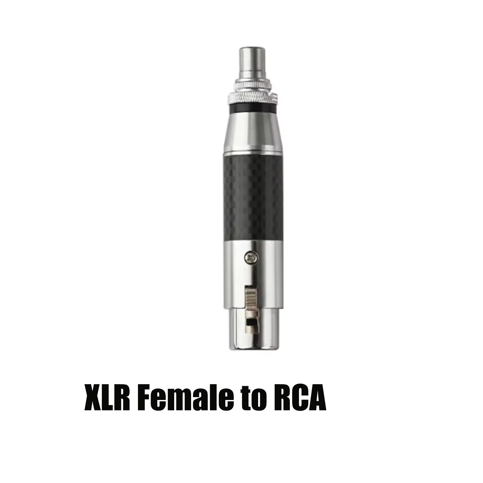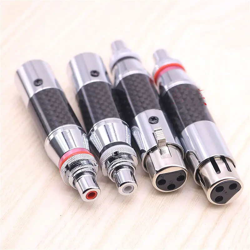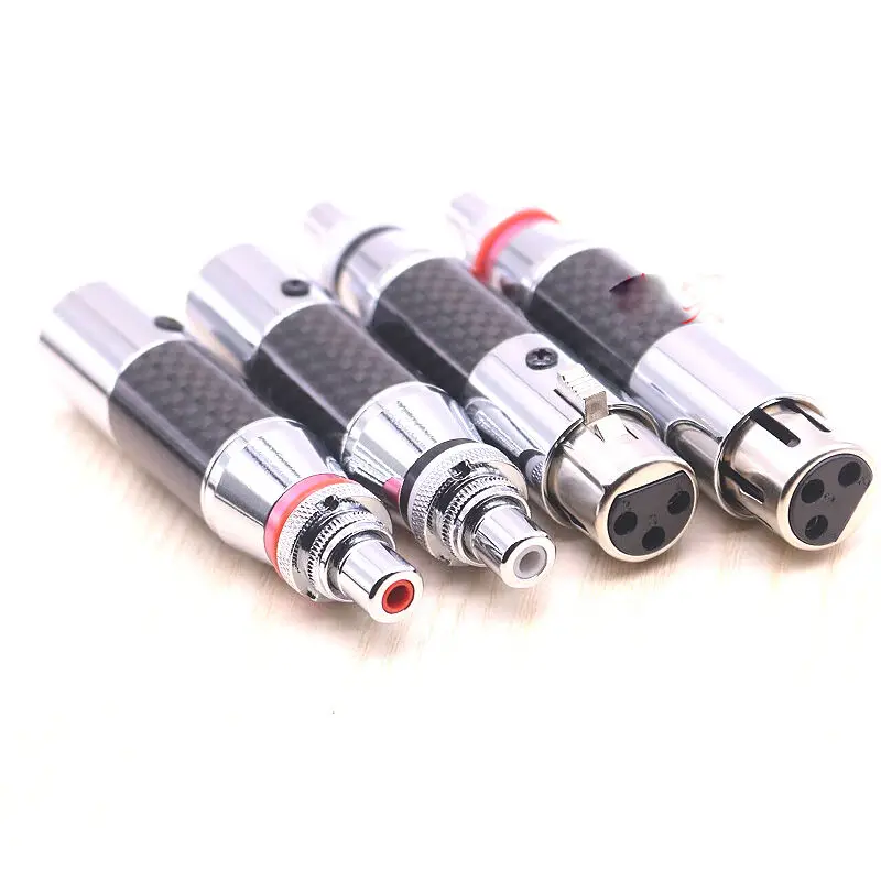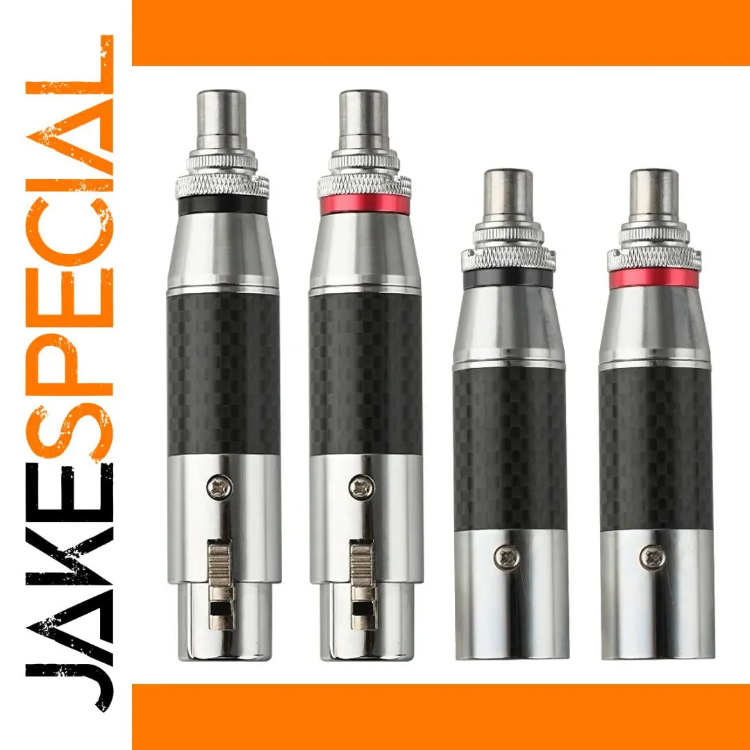 Experience premium audio connectivity with this high-end XLR to RCA connector adapter, featuring rhodium-plated RCA male and XLR male/female sockets with a 3-pin configuration in red and black. Crafted from durable carbon fiber and copper, with silver-plated conductors for optimal signal transfer, it seamlessly connects microphones, mixers, speakers, monitors, and amplifiers for audio and video applications. Its sleek design includes polished metal bases and textured silver-colored metal top sections with knurled grips, combining modern aesthetics with high durability. Certified CE and RoHS, this universal adapter is perfect for upgrading wire connections in professional audio setups, offering reliability and style in one compact, sophisticated package.