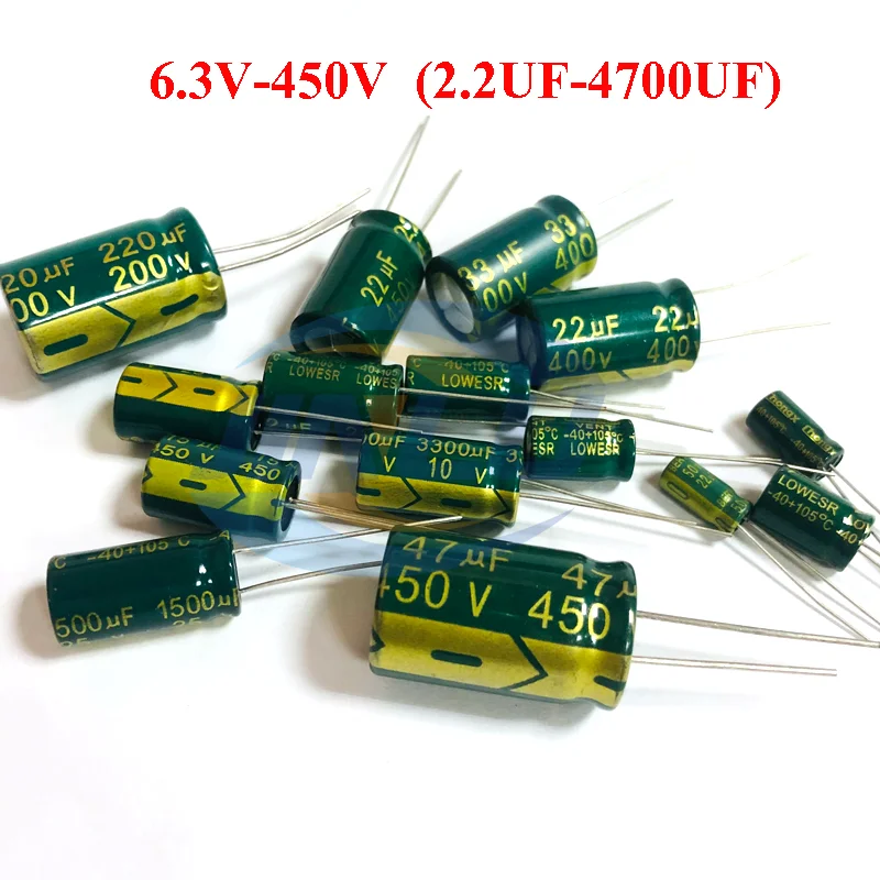 - Capacitance values from 3.3UF to 3300UF, including popular sizes such as 22UF, 100UF, and 2200UF.