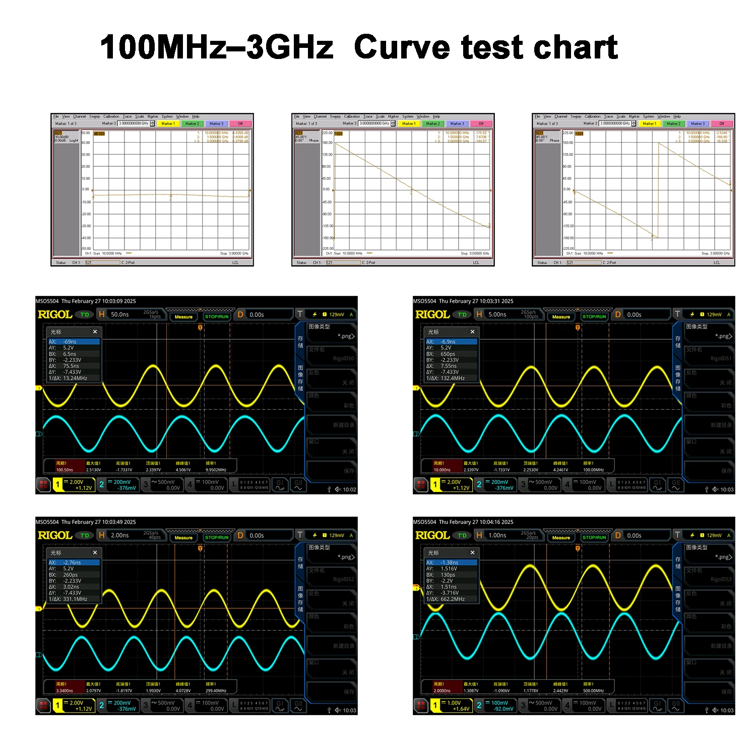 - Includes white markings and a QR code for easy identification; optimized testing conditions require adding a 50Ω load to open ports and impedance matching for scope testing.