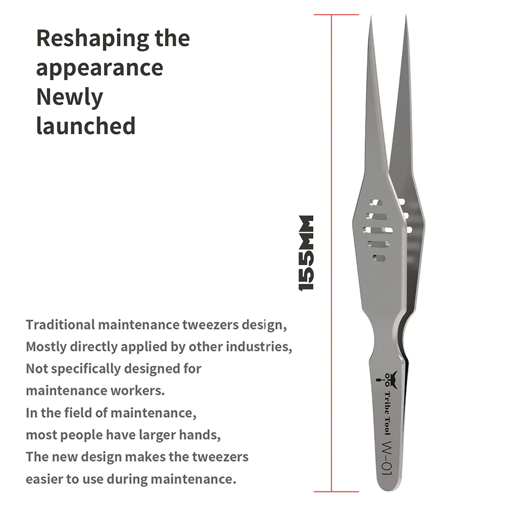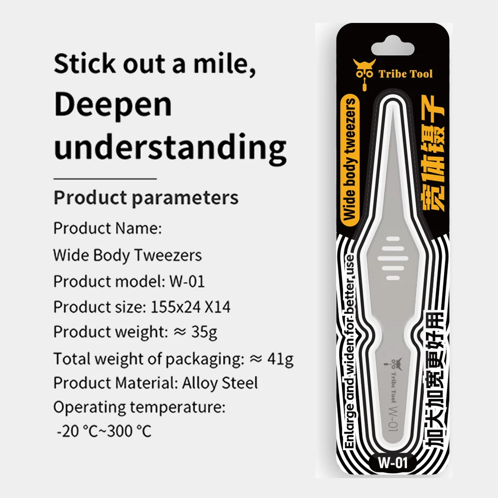 Experience precision and comfort with these Tribe Tool W-01 Wide Body Tweezers, crafted for professional and hobbyist electronics repair. With a sleek silver-gray finish, they combine durability, corrosion resistance, and ergonomic design to ensure steady handling of delicate components. The innovative wide grip provides enhanced comfort for larger hands, reducing fatigue during extended use. The slim, pointed tips allow for meticulous work on tiny resistors, capacitors, and integrated circuits without risking damage. Made of alloy steel, these tweezers withstand temperatures from -20°C to 300°C and resist chemicals like rosin and washing water, making them ideal for rigorous environments. Whether repairing smartphones, circuit boards, or DIY projects, these tweezers deliver exceptional performance every time.