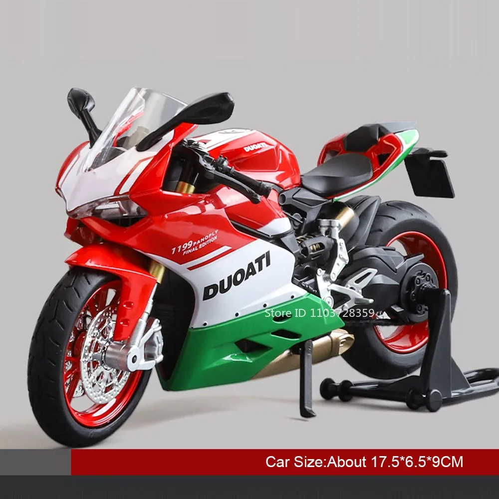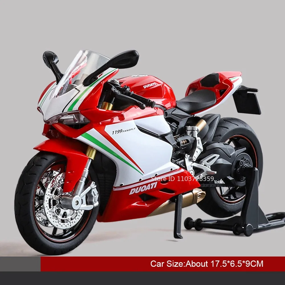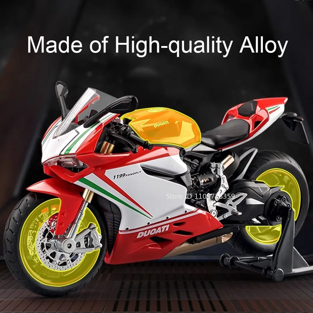 Experience the thrill of a real racing motorcycle with this high-simulation 1:12 scale model, meticulously crafted with a durable metal body, detailed plastic chassis, and rugged rubber tires. Its sleek design, sharp contours, and glossy finishes evoke a sense of speed and agility. Perfect for display or as a gift, this model captures the essence of high-performance sport bikes, incorporating realistic features such as shock absorption, front wheel steering, sound and light effects, and a detachable support frame. Its precise detailing, including air vents, decals, and chrome accents, makes it a striking addition to any collection. Feel like you are already holding a miniature champion bike in your hands, ready to race.