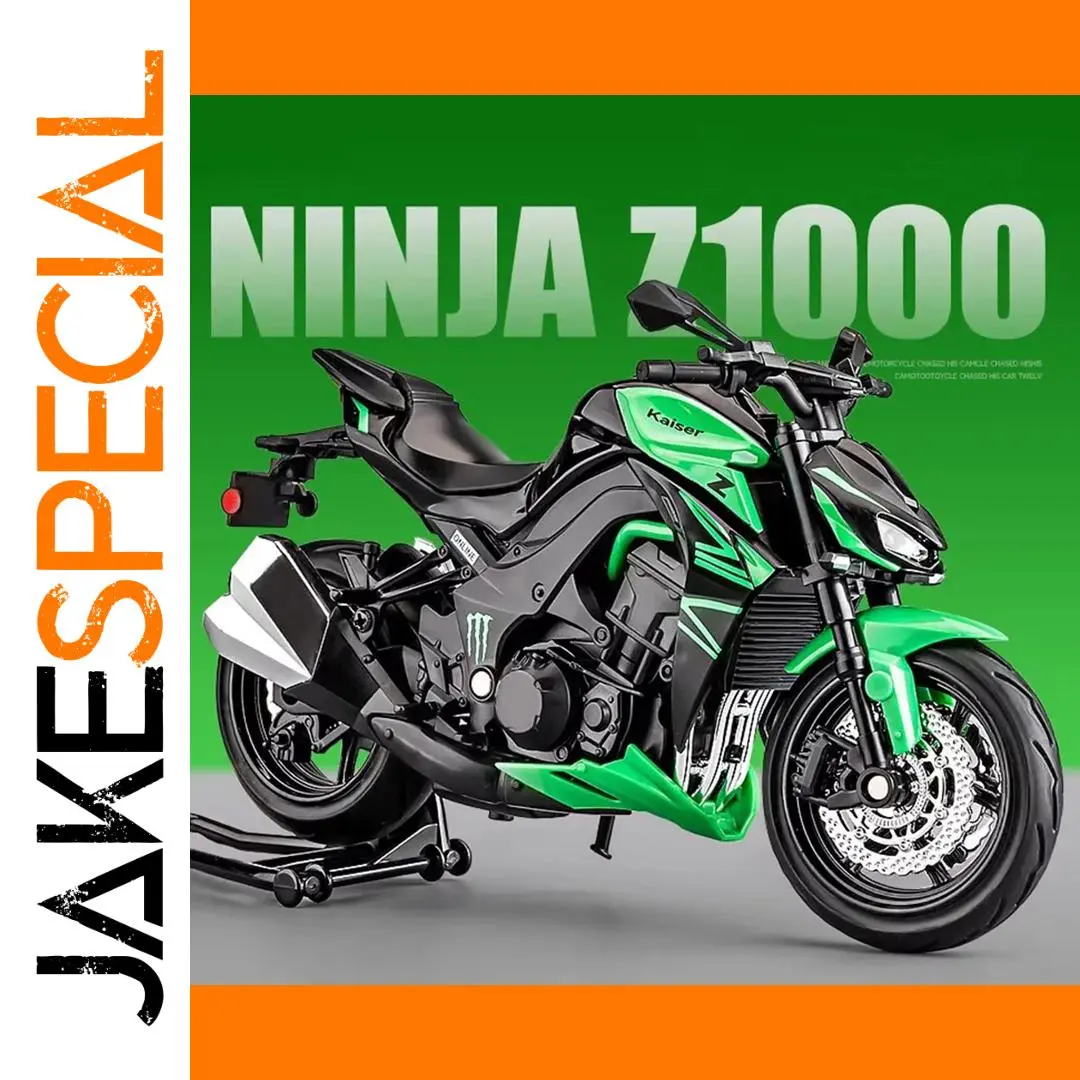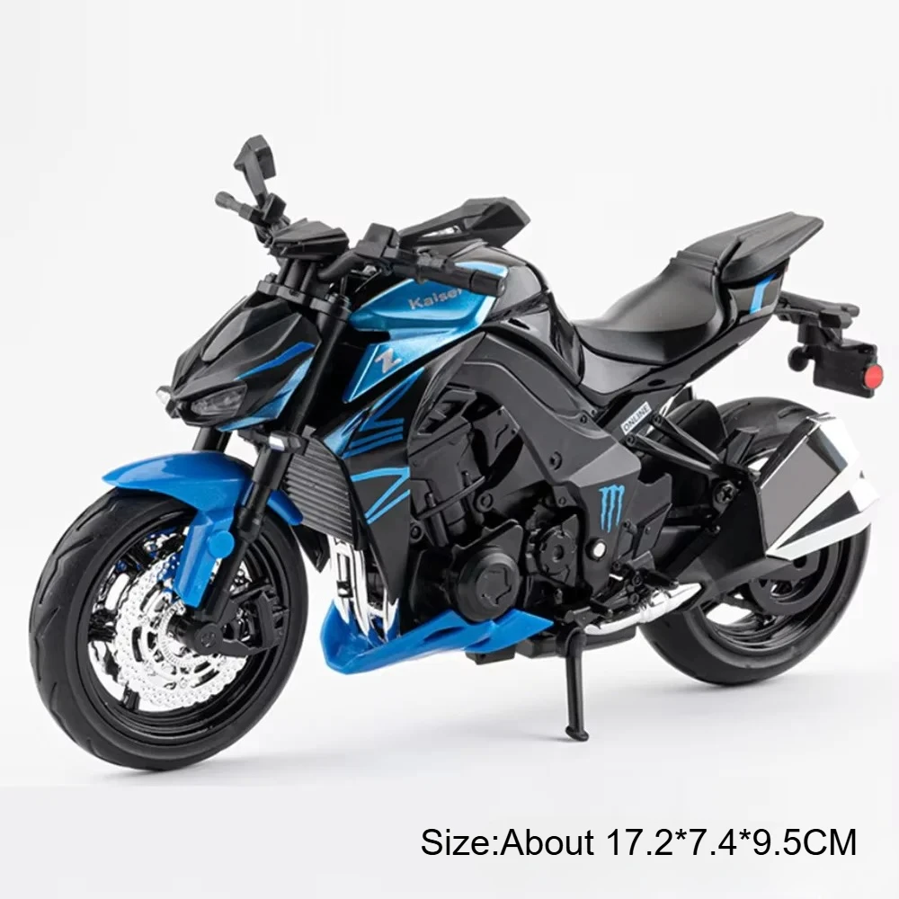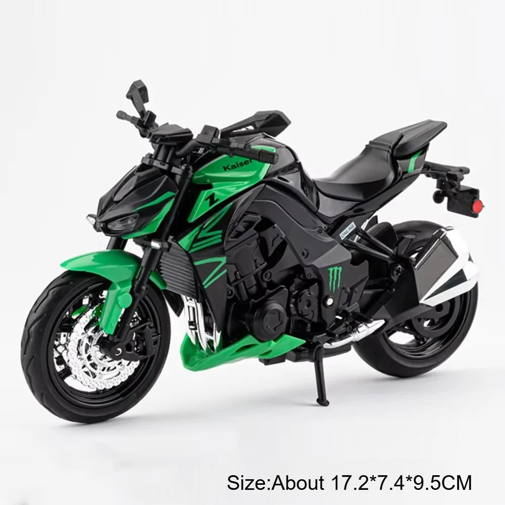 Immerse yourself in the thrill of motorcycle craftsmanship with this detailed 1:12 scale diecast model. Crafted from metal alloy, its sleek black body is accented with vibrant green graphics that highlight its aggressive and sporty design. The aerodynamic shape features sharp, angular lines and a pointed front fairing, giving it a modern, high-performance look. Functional details include built-in lights that bring the model to life, front wheel steering for interactive display, and shock absorption for realistic stability. The rubber tires and multi-spoke black wheels add to its authentic appearance. Compact yet impressively detailed, this model measures approximately 17.2 x 7.4 x 9.5 cm for the Z1000 variant, making it an ideal collectible or gift for motorcycle enthusiasts.