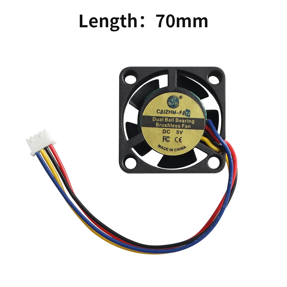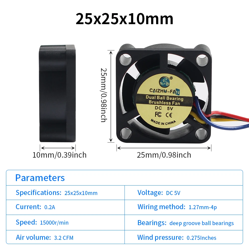 This high-performance 2510 dual ball bearing brushless cooling fan operates at 15,000 RPM with 5V power, designed for Bambu Lab X1 and X1C series 3D printers. It features a durable black square frame with four mounting holes, a circular central hub with detailed specifications, and a four-wire wiring system for PWM control and speed feedback. The fan’s slightly curved blades enhance airflow and heat dissipation, ensuring optimal cooling efficiency and long service life. Its sleek, utilitarian design combines durability and high-tech aesthetics, making it a reliable upgrade for maintaining consistent performance in your 3D printing setup.