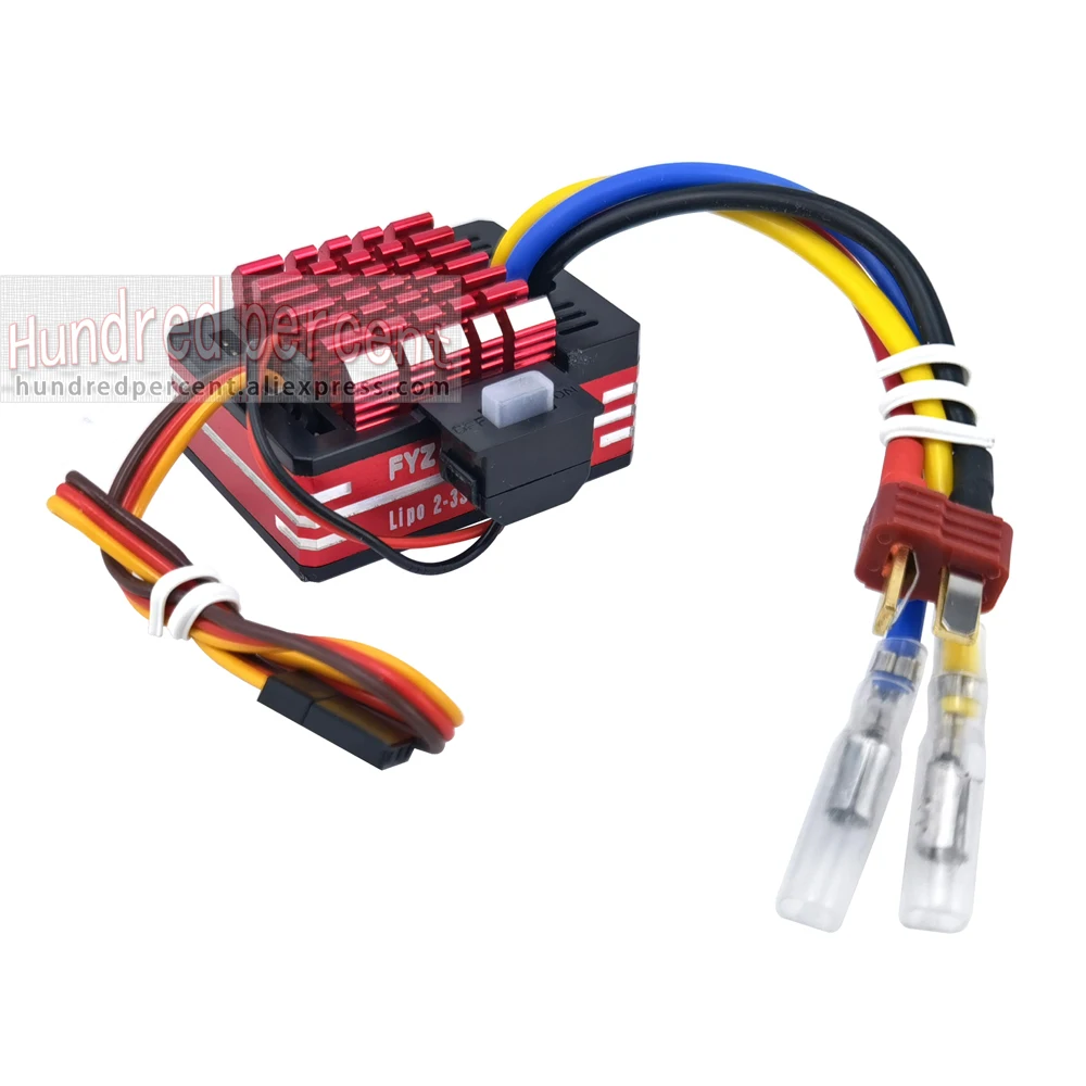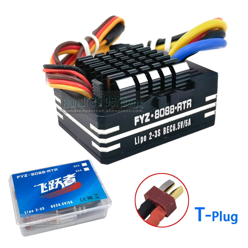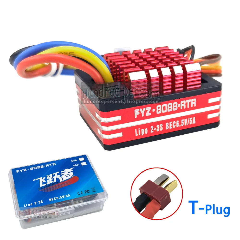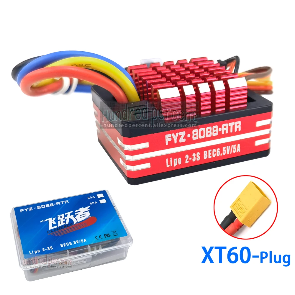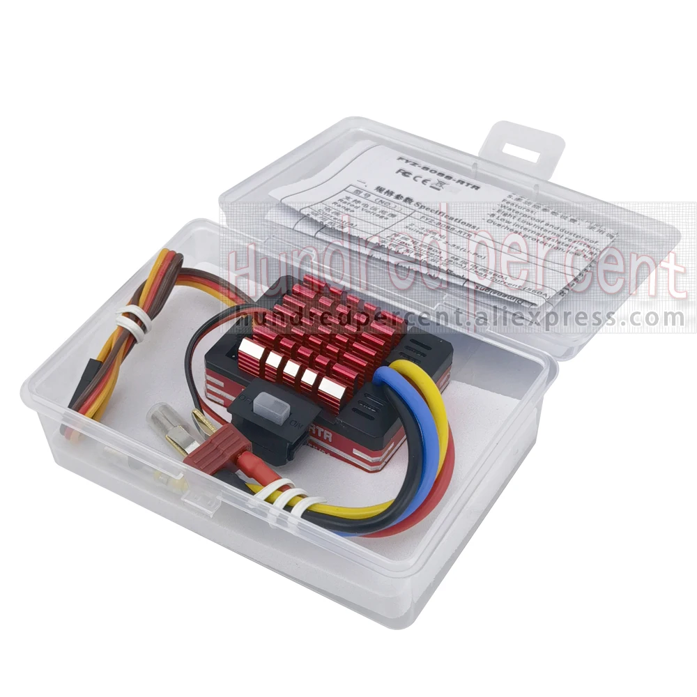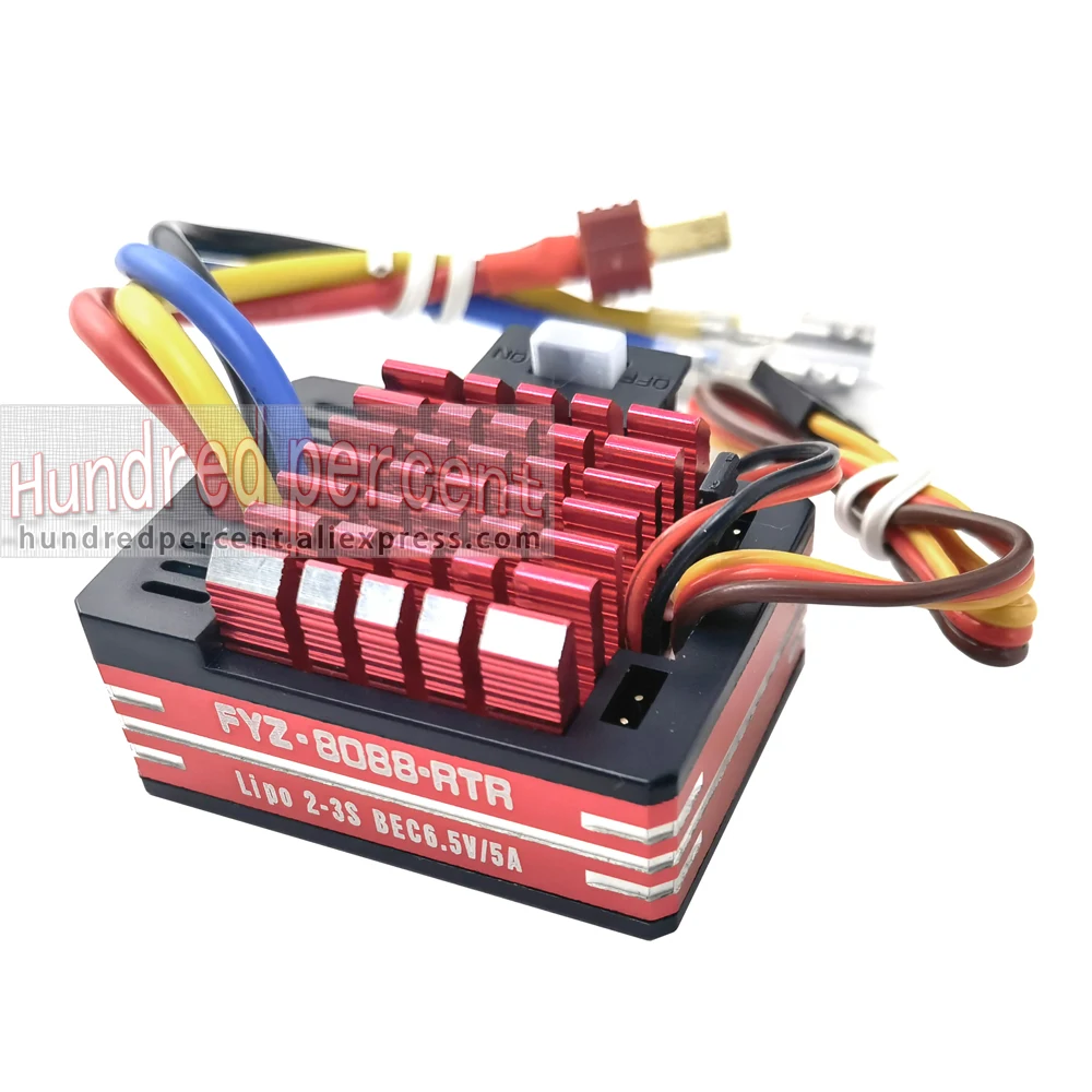 Experience reliable performance with the FYZ 8088 brushed speed controller ESC, designed for 1:10 and 1:8 scale RC vehicles such as Traxxas SCX10 and HSP models. This waterproof ESC features a robust 80A continuous current rating, making it ideal for high-powered applications. Crafted from durable ABS plastic, it boasts a sleek black or red finish with XT60 connectors for seamless power transfer. Its compact rectangular design includes heat-dissipating metal heatsinks arranged in a grid pattern, complemented by white side stripes for a modern look. Perfect for serious RC enthusiasts, this model provides precise control and durability, elevating your vehicle’s performance.