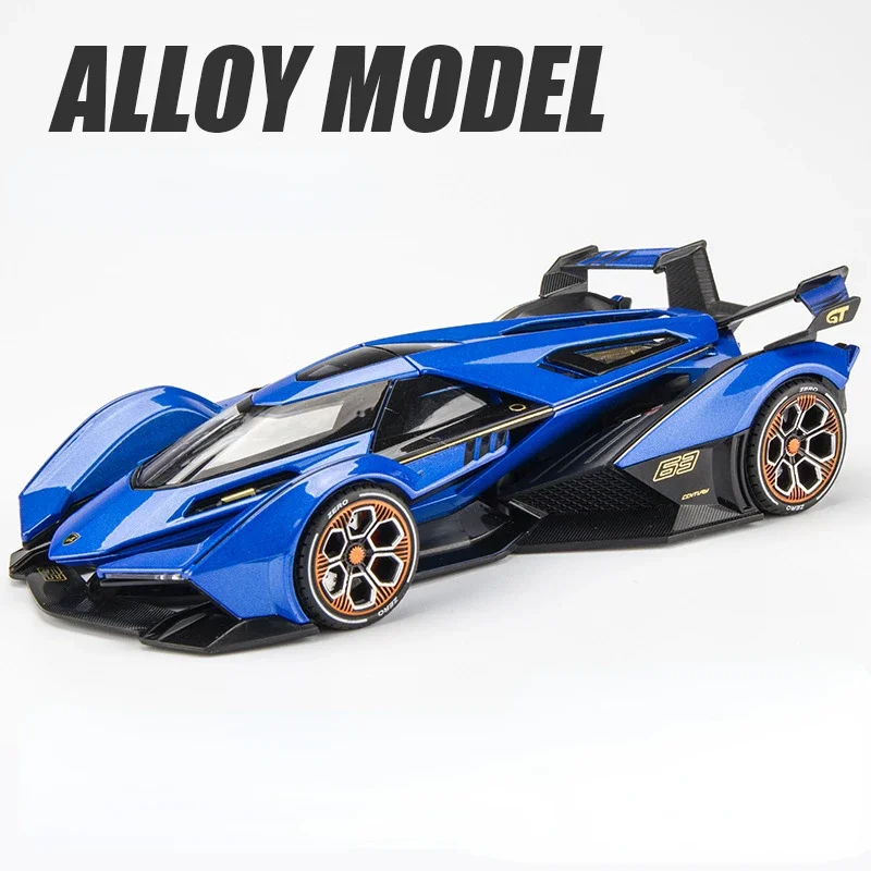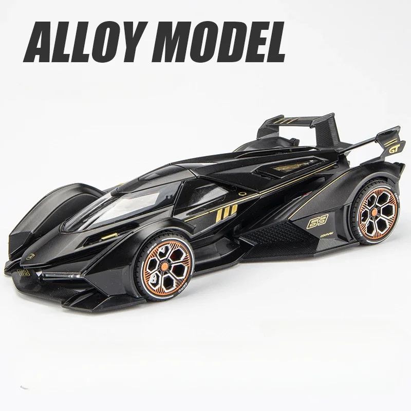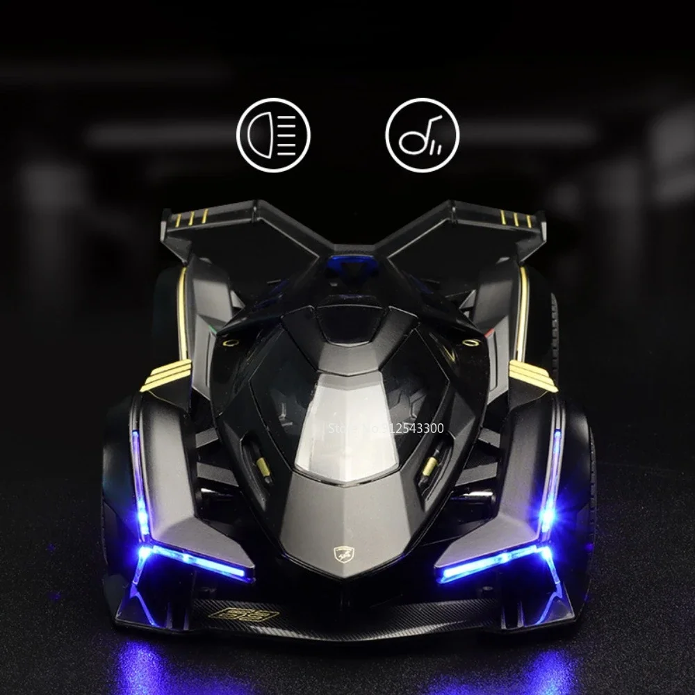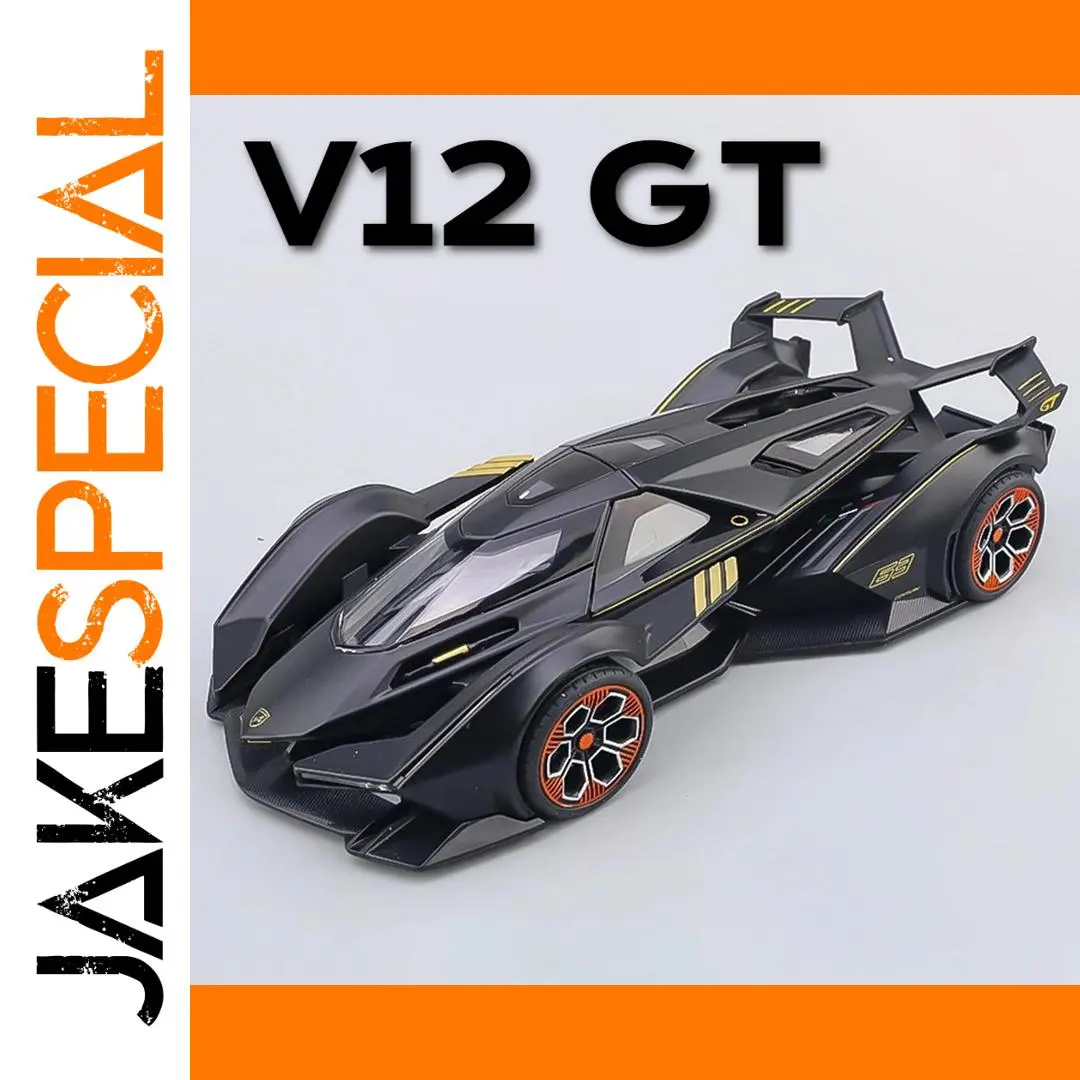 - The vehicle measures approximately 20 x 9 x 4.5 cm for the V12GT model; its sleek design includes sharply angled panels, aerodynamic vents, and a prominent rear wing for a sporty look.