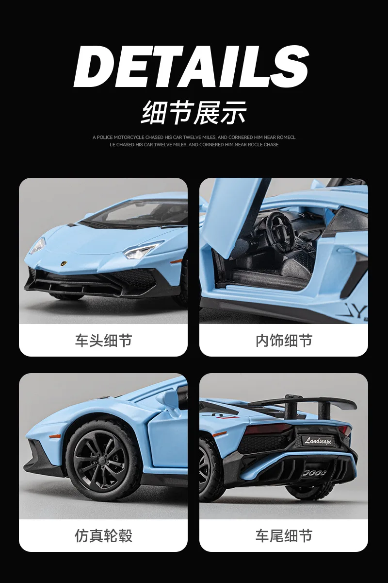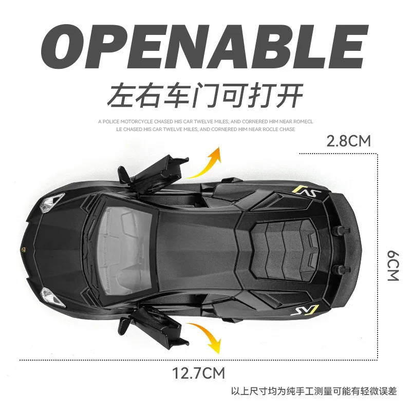 This 1:36 scale diecast alloy sports car model measures approximately 12.7 cm x 2.8 cm x 6 cm and features functional sound, light, flashing lights, and vocalization effects powered by lithium batteries. Designed with a sleek, aerodynamic silhouette and detailed body lines, it comes in vibrant blue, red, or black variants, each with a boxed or non-boxed packaging option. Operated via force control, this collectible model is suitable for enthusiasts aged 14+ or 18+, offering an engaging, realistic replica of a high-performance exotic supercar—perfect for display and collection.