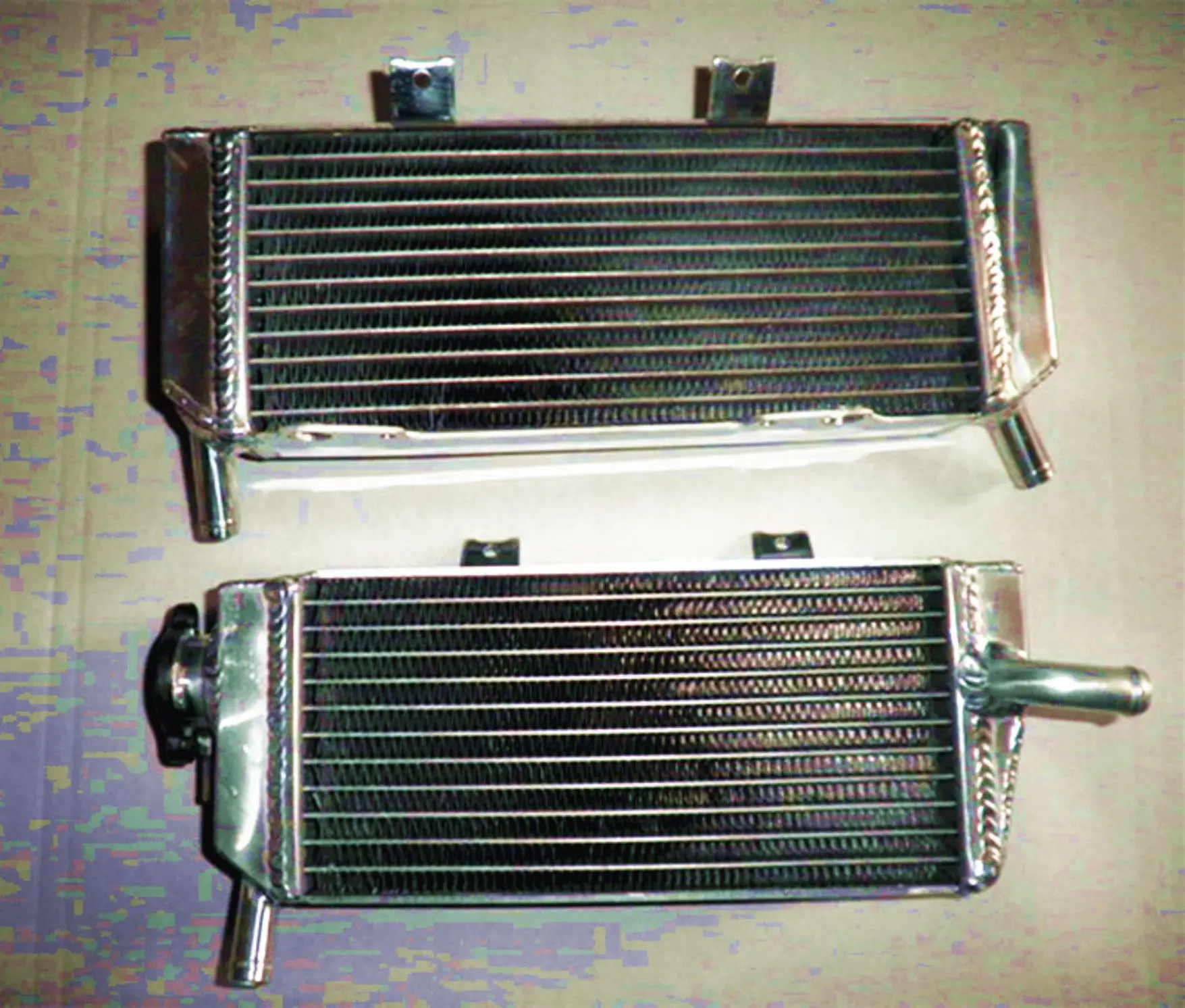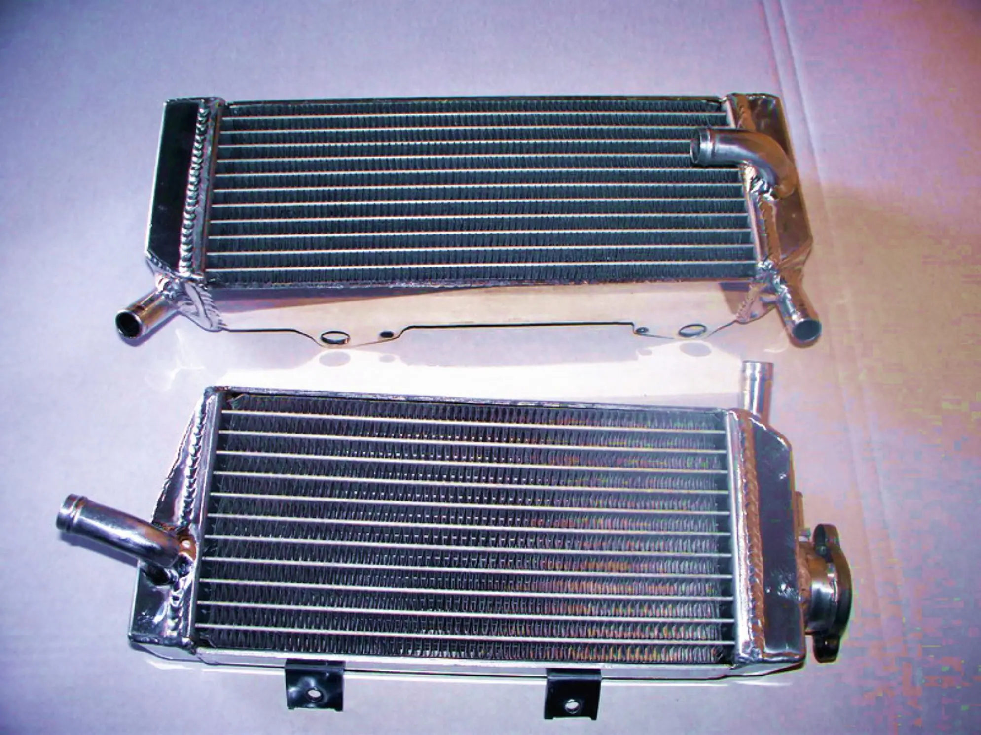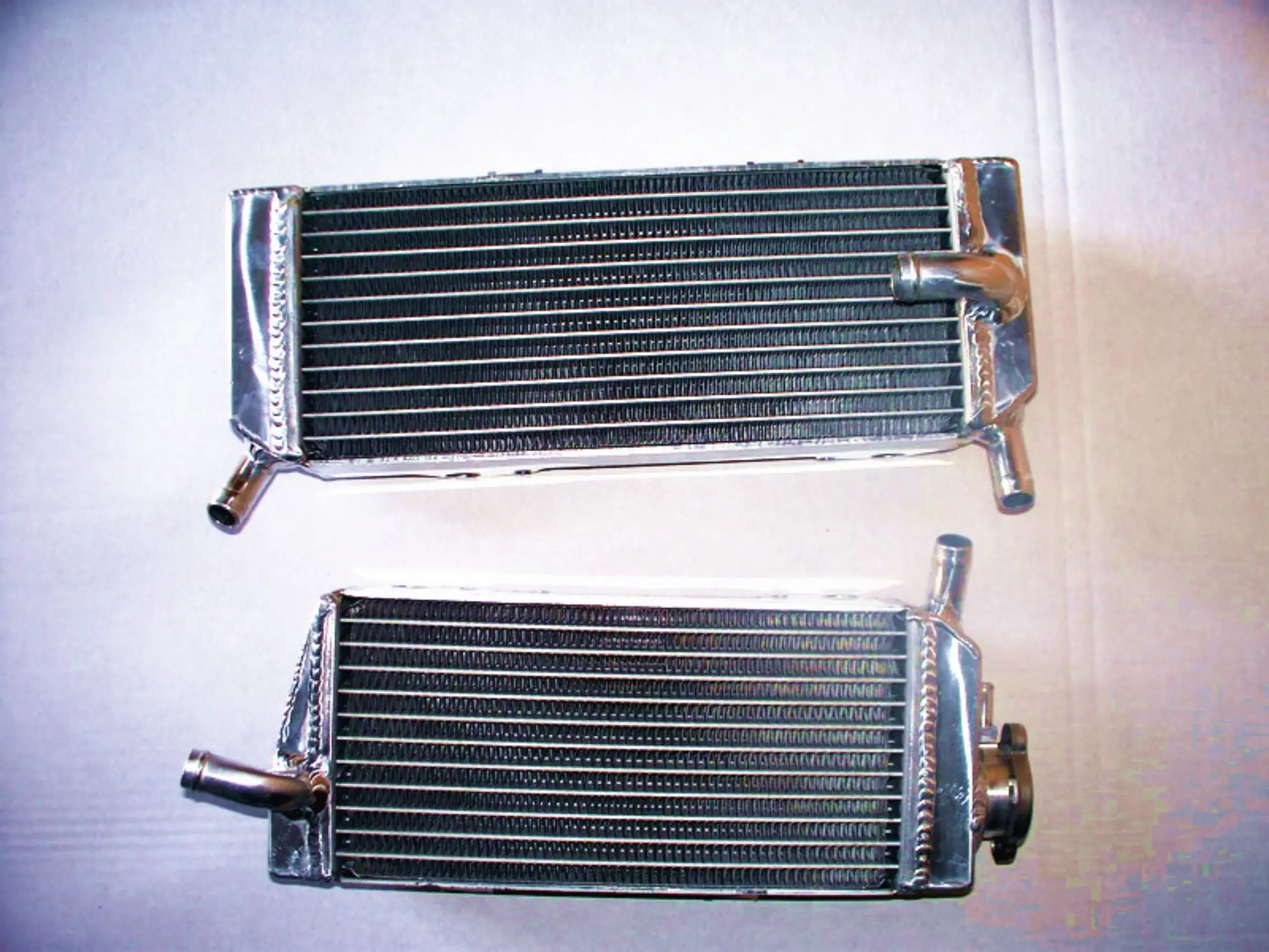 Experience superior cooling with this pair of high-quality aluminum radiators, specifically designed for the 2005-2006 KTM 250 SXF motorcycle. Crafted from durable T-6061 aluminum, these radiators feature a sleek rectangular shape with slim, evenly spaced horizontal fins that maximize heat dissipation. The core is welded in a vacuum brazing furnace, and the tanks are TIG-welded, ensuring a robust and seamless construction free from epoxy. With about 40% greater cooling capacity than standard models, these radiators drastically improve engine performance and reliability during intense riding. Their lightweight yet heavy-duty build provides long-lasting durability and easy installation, making them an excellent upgrade for KTM enthusiasts seeking efficient thermal management and enhanced motorcycle endurance.
