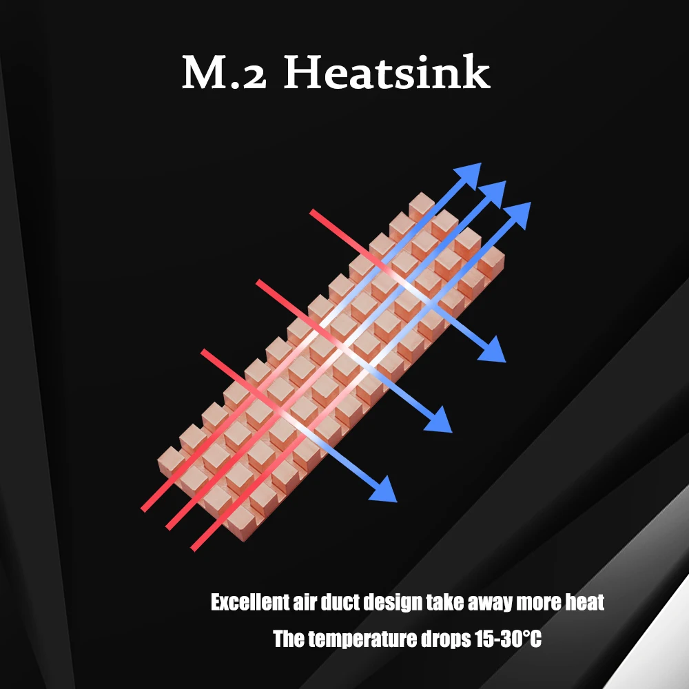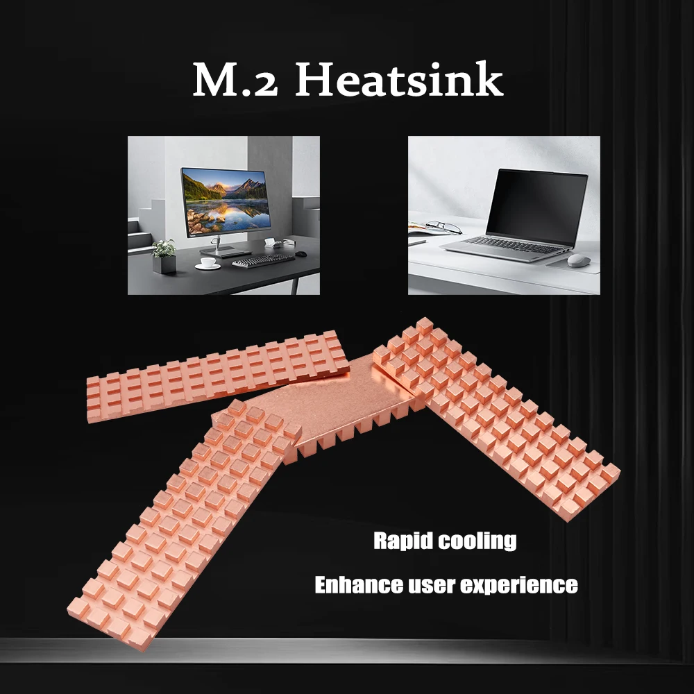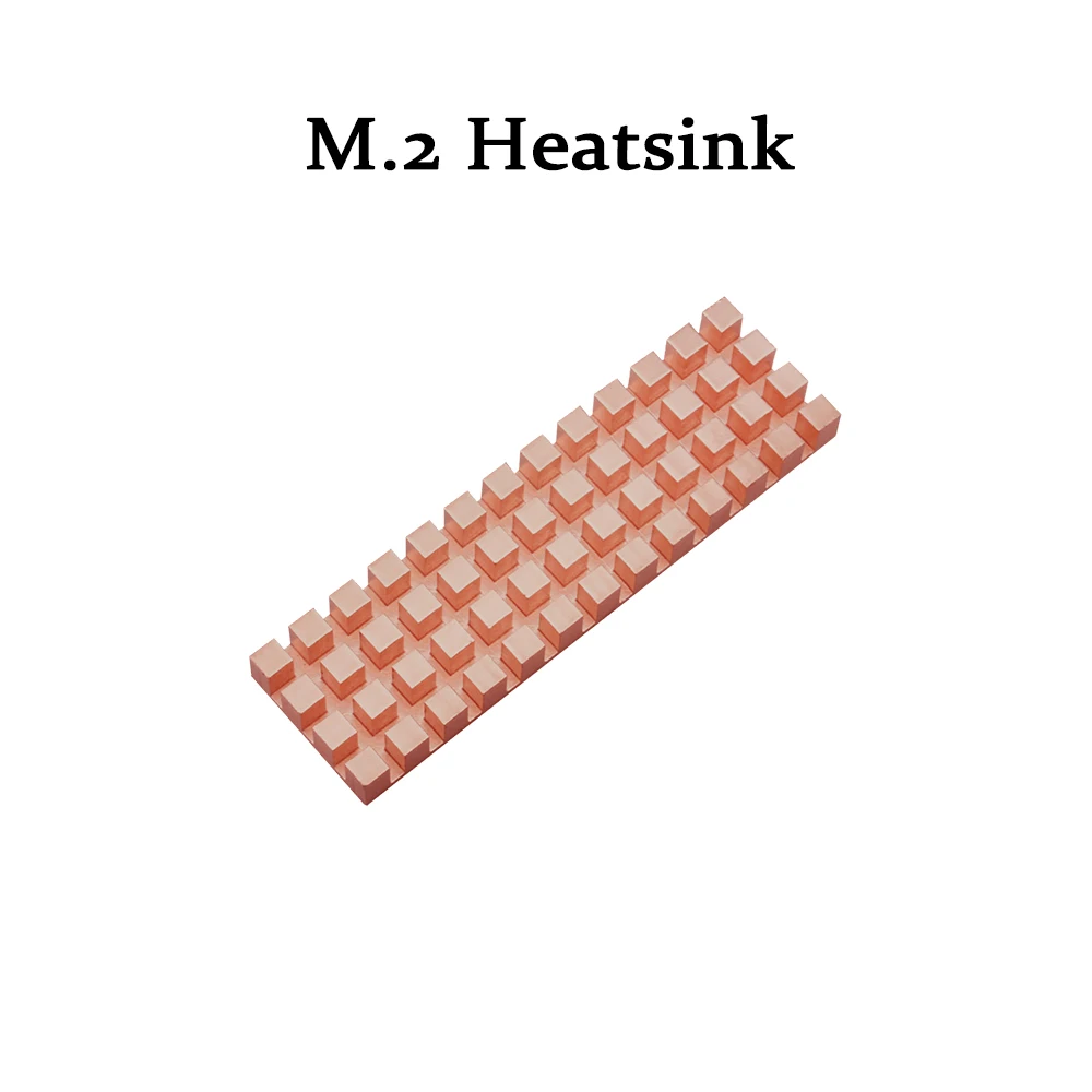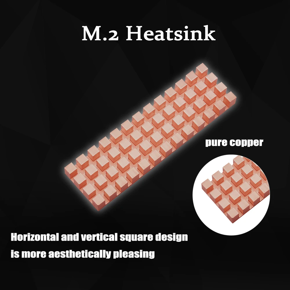 This high-performance M.2 heatsink crafted from high thermal conductivity red copper (386.4 W/m·K) features a sleek, polished surface and an innovative groove design for optimal heat dissipation. Available in thicknesses of 2mm, 3mm, 4mm, and 6mm, it measures 7mm x 2mm and weighs between 18g and 41g. Designed to effectively reduce operating temperatures by 15-30°C, it ensures reliable SSD performance while maintaining a compact, minimalist aesthetic with sharp, geometric fins. Suitable for cooling M.2 SSDs, the package includes one heatsink and rubber rings for secure installation.
