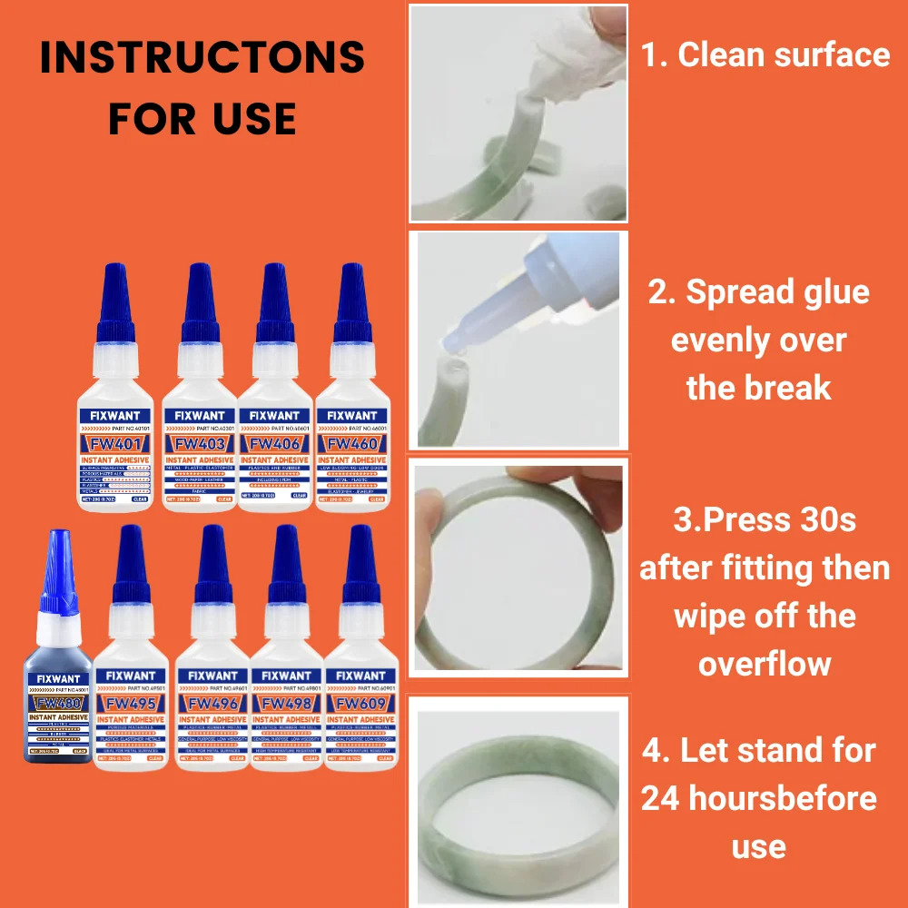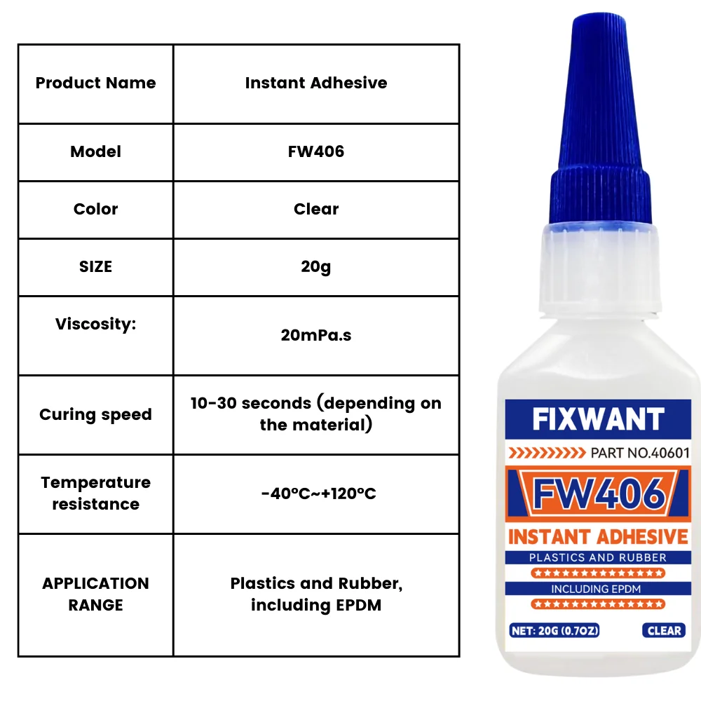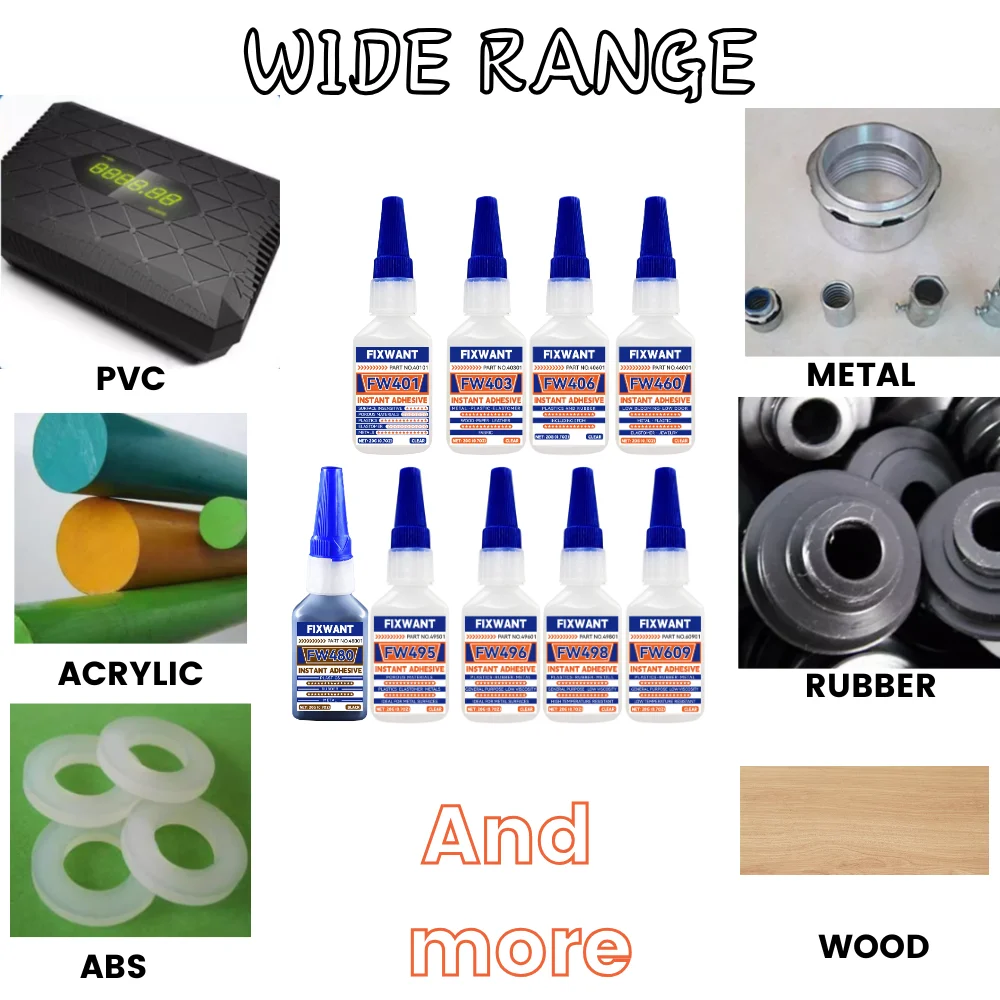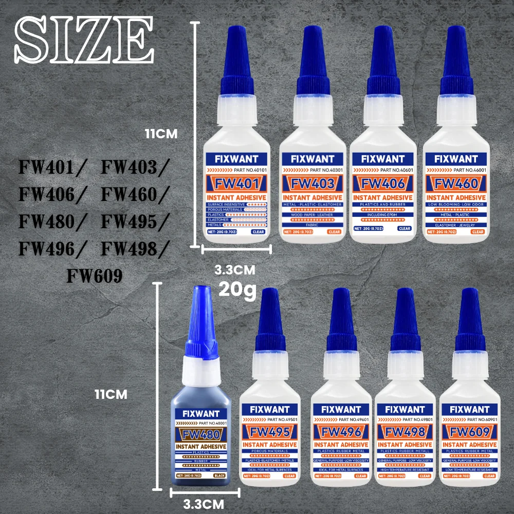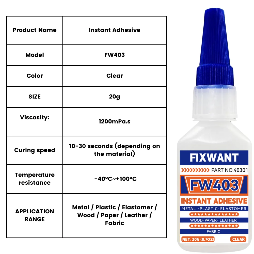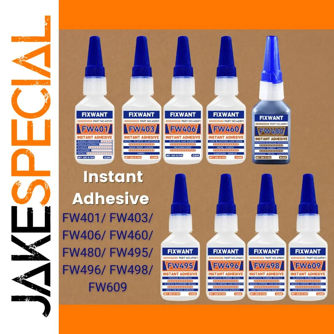 This set of FIXWANT instant adhesives features nine high-performance, precise bonding solutions with viscosities ranging from 20 mPa·s to 1200 mPa·s, enabling rapid bonds within 10-30 seconds and achieving full strength after 12 hours. Designed for versatility, they bond porous materials like wood, paper, leather, fabric, as well as metals, plastics, rubber, and elastomers. With high temperature resistance from -60°C up to +180°C (depending on model), these adhesives feature low odor, low blooming, and excellent moisture resistance. Models include FW401, FW403, FW406, FW460, FW480, FW495, FW496, FW498, and FW609, each tailored for specific bonding needs, ensuring durable, long-lasting results for various applications.