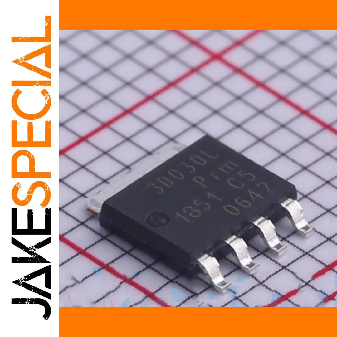 Discover the this innovative N-channel field-effect transistor, model 3D030L, designed to meet your high-current and voltage demands. Featuring a compact SOT-669 package, it provides robust performance for demanding electronic applications. Its sleek, black rectangular body with sharp edges and smooth surface exemplifies precision engineering. The crisp white alphanumeric markings, including “3D030L,” ensure easy identification, while the shiny metallic pins are bent outward for secure mounting and reliable electrical contact. Perfect for high-density circuit board designs, this transistor offers excellent current handling capabilities, maintaining stability at 30V and 100A continuous drain current. Trust in its quality and originality, and elevate your electronic projects efficiently with this durable component.