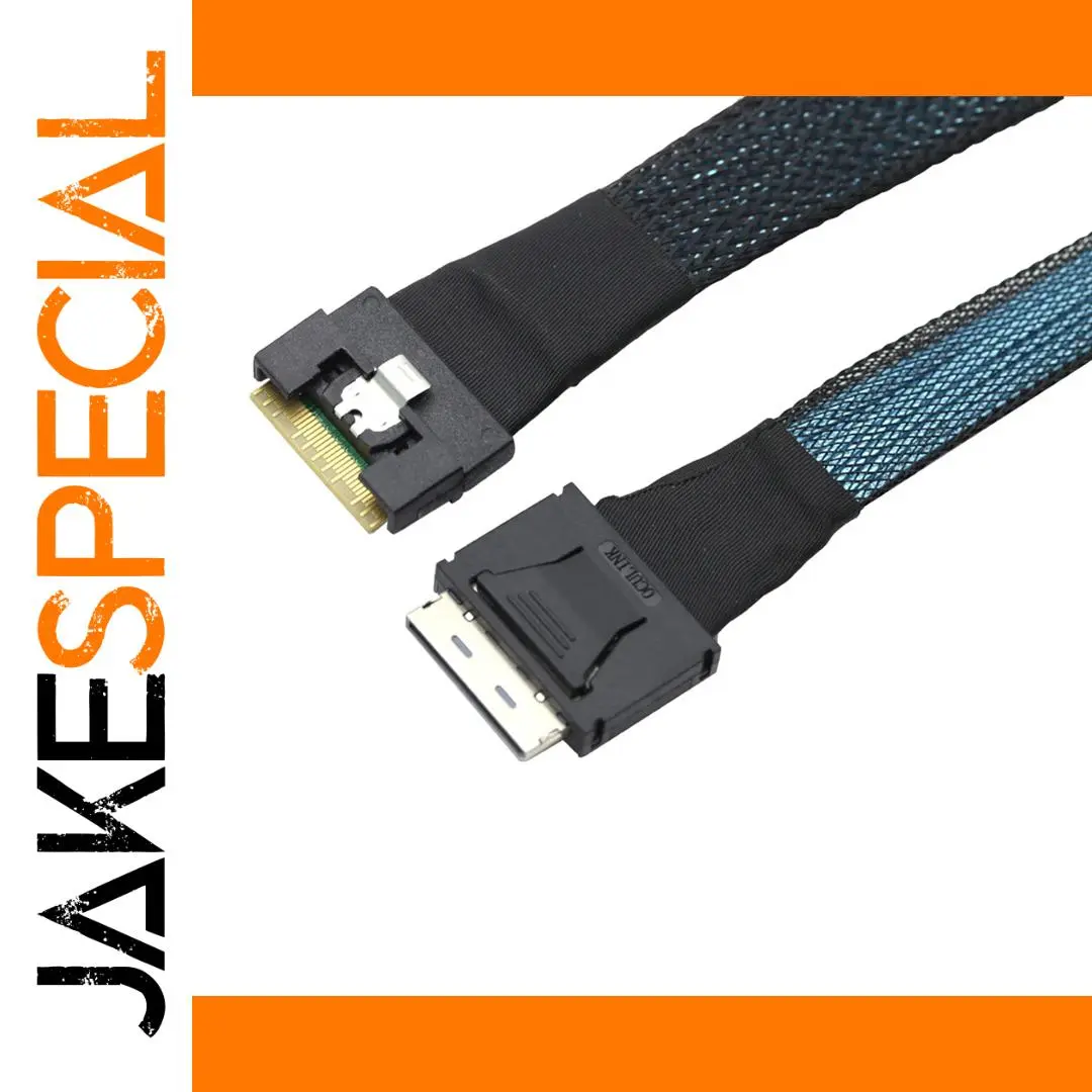 Enhance your server and PC connectivity with this high-performance internal cable featuring a PCIe Gen 4 SlimSAS 8654 8i connector and an OCulink 8611 8i connector, supporting PCI Express Gen 4 specifications. Available in 50 cm and 100 cm lengths, this durable cable is designed for reliable internal connections, ensuring optimal high-speed data transfer in server and PC systems. Its sleek black protective woven mesh sleeving offers enhanced durability and a professional appearance, while the textured black plastic housings with gold-plated contact pins provide secure, high-quality contacts. Perfect for building or upgrading high-performance storage solutions with a streamlined, technically sophisticated aesthetic.