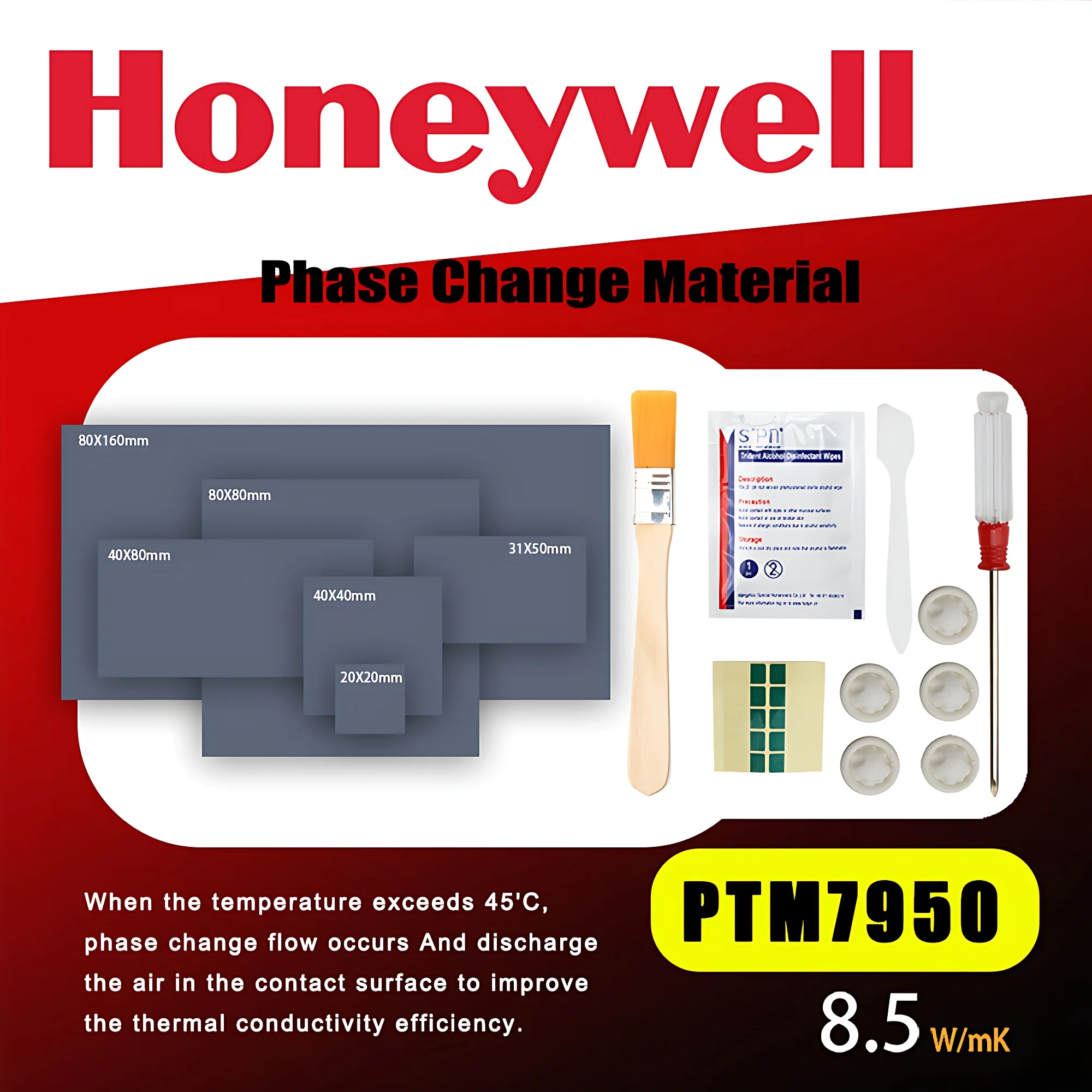 Experience superior cooling performance with this phase change thermal pad featuring a thermal conductivity of 8.5 W/mK and a thermal impedance of 0.04°C·cm²/W at no shim. Designed for precise heat transfer in high-performance devices, it changes from solid to liquid at 45°C to ensure optimal contact and extend service life. Available in multiple sizes including 20×20 mm, 30×51 mm, 40×40 mm, 40×80 mm, 80×80 mm, and 80×160 mm, with a thickness adjustable from 0.02 mm to 0.25 mm. The durable material withstands 150°C baking for 1000 hours and 1000 temperature cycles between -55°C and +125°C, making it ideal for CPUs, GPUs, power supplies, and other demanding cooling applications.