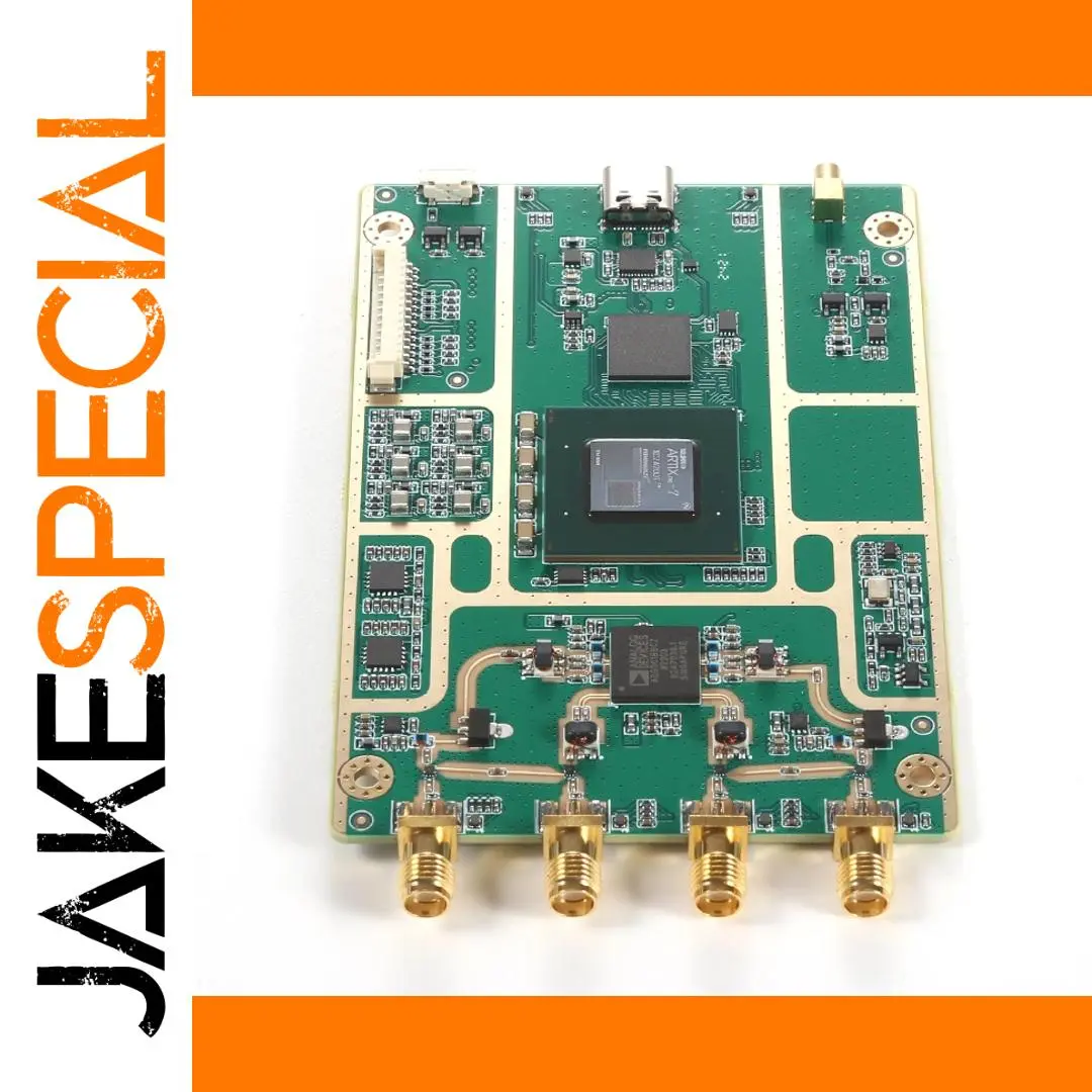 Experience the power of this compact, portable SDR device designed for advanced radio frequency applications. Built with a lush green PCB, it combines sleek aesthetics with technical excellence. The device features a central black FPGA chip, specifically a Xilinx Artix7 series (XC7A100T or XC7A200T), ensuring efficient resource use and high performance. Four gold-colored SMA connectors at the bottom enable high-quality antenna connections, emphasizing its RF capabilities. Its overall design exudes a professional, high-tech feel, perfect for field research, spectrum analysis, or communication experiments. With features like external clock tuning, PPS synchronization, and USB Type-C interface, this device is tailored for demanding scientific and industrial use. Imagine enhancing your projects with this reliable, sophisticated radio spectrum tool that fits comfortably in your hands and your workflow.
