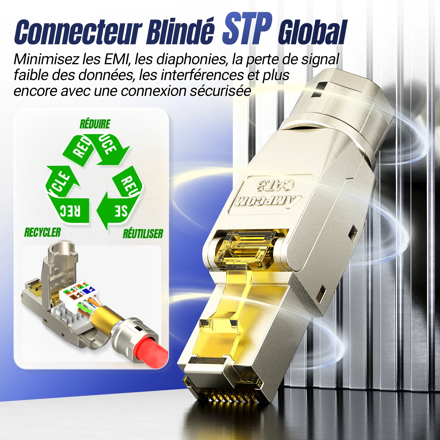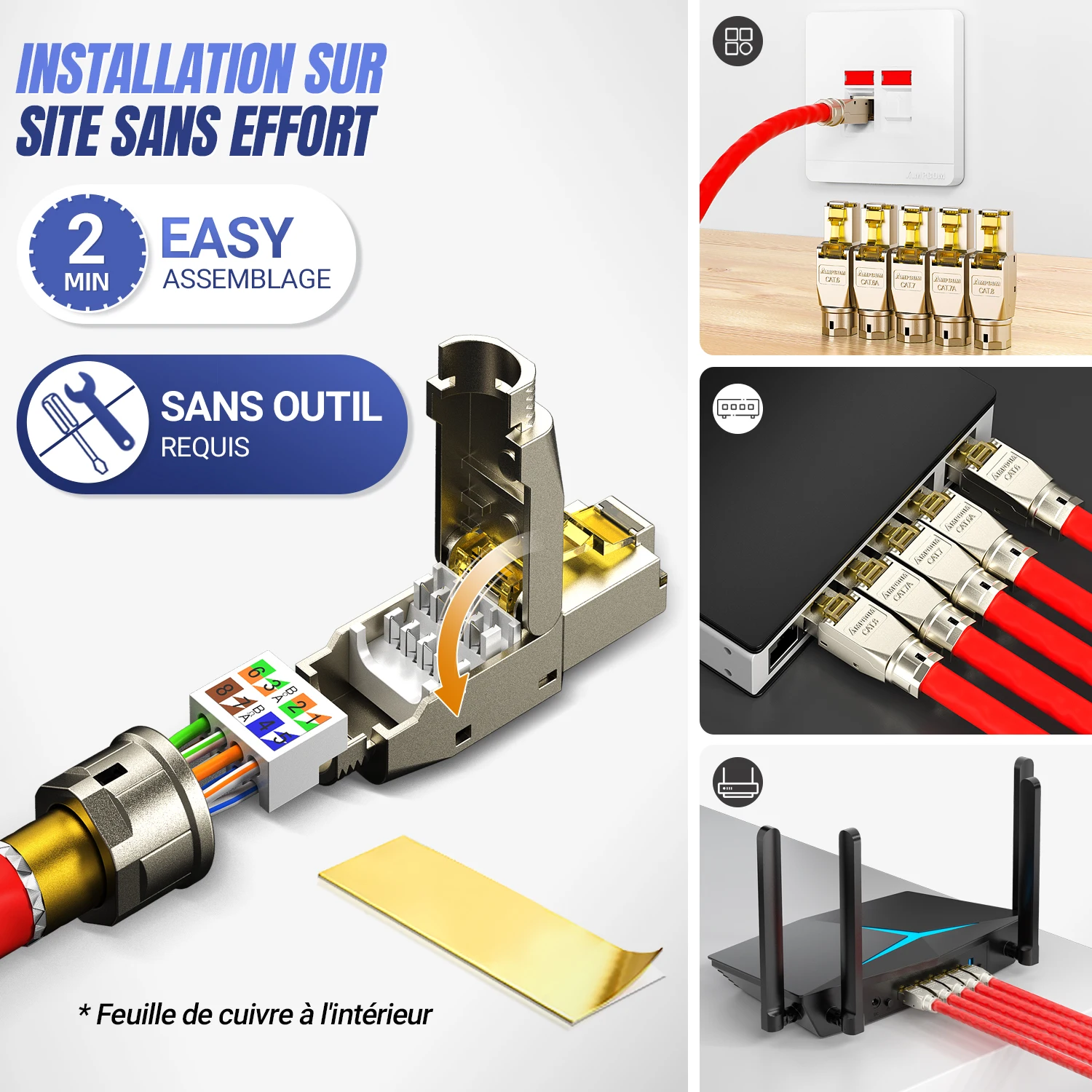 Imagine upgrading your network with a durable, high-performance connector that guarantees stability and efficiency. This shielded RJ45 connector simplifies installation with its tool-free, reusable design, saving you time and effort. Its sleek metallic exterior, combined with professional-grade technical features, ensures your Ethernet connections are robust and interference-resistant. Whether for data centers, corporate networks, or home high-speed setups, this connector provides the reliability you need. Take advantage of its compatibility with CAT6 to CAT8 cables and data transfer speeds up to 40 Gbps. Make the smart choice and enhance your network’s performance today.