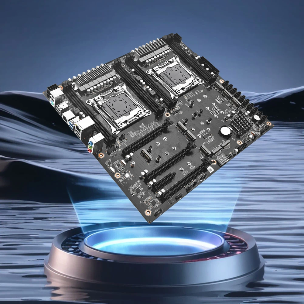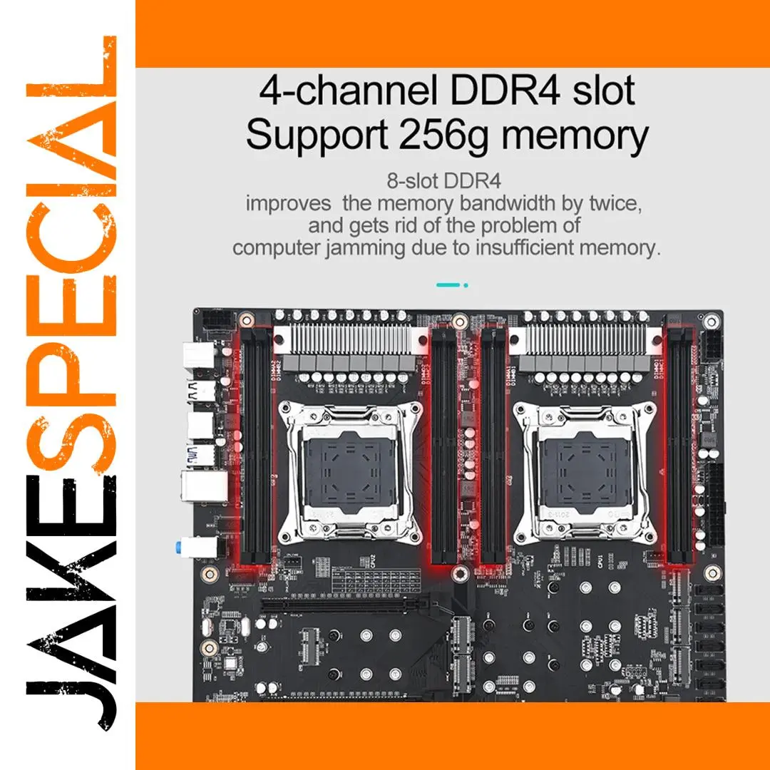 Experience the power and reliability of this high-end X99 D4 Dual Pro motherboard, perfect for demanding professional tasks like virtualization, video rendering, and complex multitasking. Its sleek, industrial aesthetic features a primarily black and dark gray color scheme with metallic accents on critical areas, complemented by crisp white RAM slots and SATA ports, offering a modern yet robust appearance. Designed for high-performance builds, this EATX motherboard provides ample space for dual Intel Xeon E5-2600 V3/V4 processors, supporting up to 256GB of DDR4 memory with quad-channel configuration. The reinforced metal frame and thermal armor ensure optimal cooling during intensive workloads. Its carefully organized array of ports and expansion slots ensures seamless connectivity and upgradeability for your advanced computing needs.