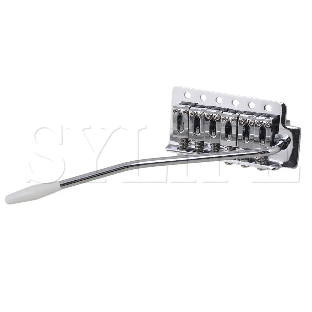 Enhance your electric guitar with this high-quality chrome tremolo bridge featuring a 10.5mm string spacing and a sleek, reflective finish. Constructed entirely of durable metal, it offers precise machining and a modern aesthetic, perfect for upgrading or replacing your existing tremolo system. The set includes one sturdy bridge, a metal claw, three tension springs, eight mounting screws, and a curved tremolo arm, all designed to ensure stability, durability, and smooth performance. Its polished surface and robust build make it an attractive addition to any guitar, providing reliable function and a sophisticated look for adult collectors and enthusiasts seeking premium craftsmanship.