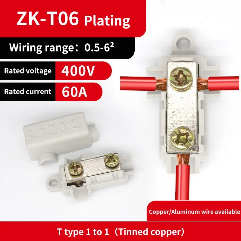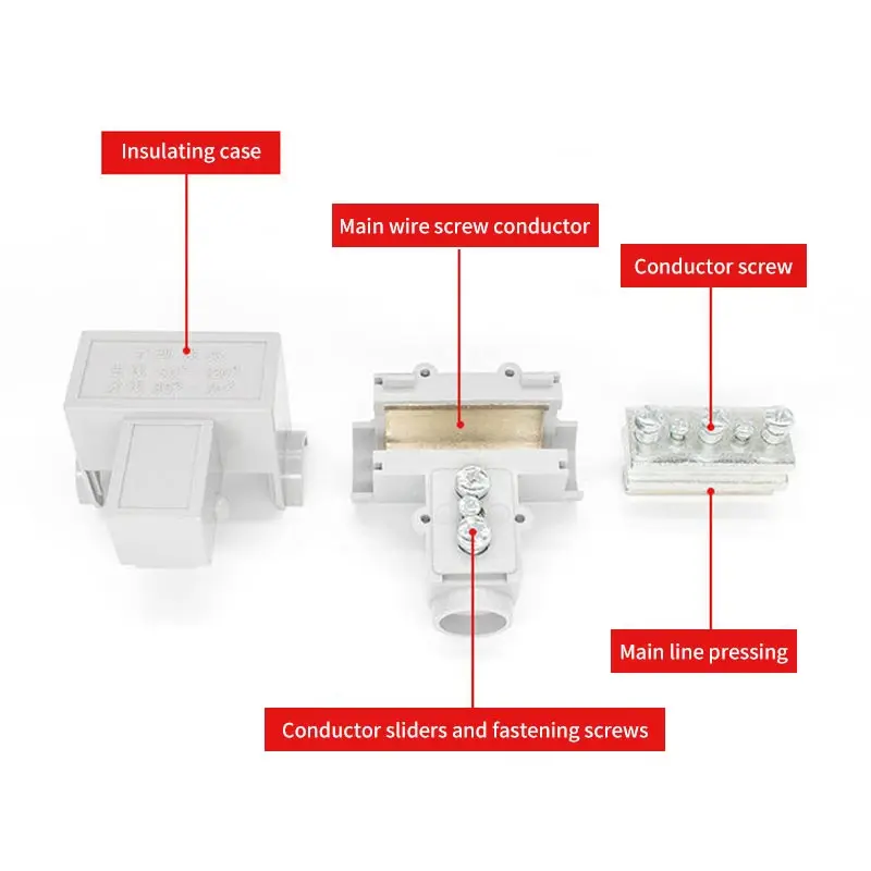 This robust, industrial-style T-type cable splitter is designed for high-current electrical connections, featuring a sturdy metallic silver connector with a textured finish that reflects light subtly. Its light gray insulative body offers durability and a sleek, professional appearance. The product is equipped with multiple Phillips-head screw terminals securely fastening two red cables, ensuring no disconnection during operation. The connector includes mounting holes that allow secure installation in various settings. Its 3-way configuration provides efficient cable division for heavy-duty electrical systems. The overall design emphasizes strength, reliability, and high performance, making it suitable for industrial machinery, power distribution, or other demanding electrical applications. The high-quality materials and precise construction guarantee longevity and secure connections.