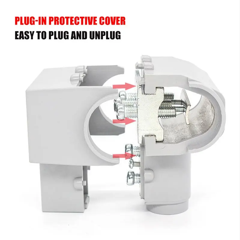 - Body made of insulative, light gray material with mounting holes, allowing flexible and safe installation in various industrial setups.