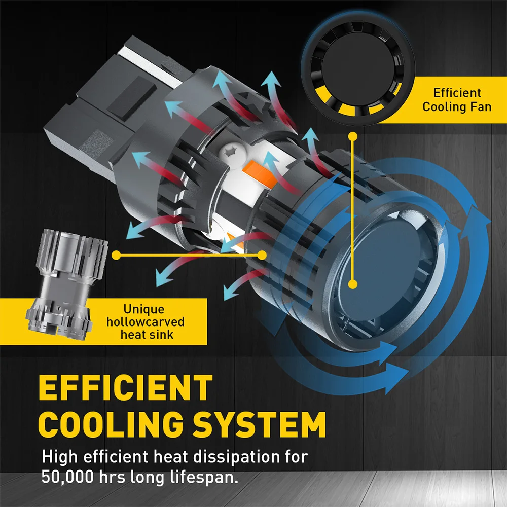 Enhance your vehicle's safety and style with this high-performance LED turn signal bulb. Featuring a sleek, cylindrical design with a black plastic base and metallic upper section, it exudes a modern industrial look. The vibrant amber sections emit a powerful 1800 lumens of 2200K amber light, offering exceptional brightness during night driving or adverse weather conditions. Built with advanced cooling technology—aircraft-grade aluminum body and integrated fan—this bulb ensures efficient heat dissipation, prolonging its lifespan. Compatible with multiple socket types including 1156 BA15S P21W, 1156 BAU15S PY21W, 3157 P27/7W T25, and 7440 W21W WY21W T20, it is designed for universal fit and hassle-free installation. This LED bulb delivers durability, high luminosity, and a contemporary look that elevates your vehicle’s appearance and safety.