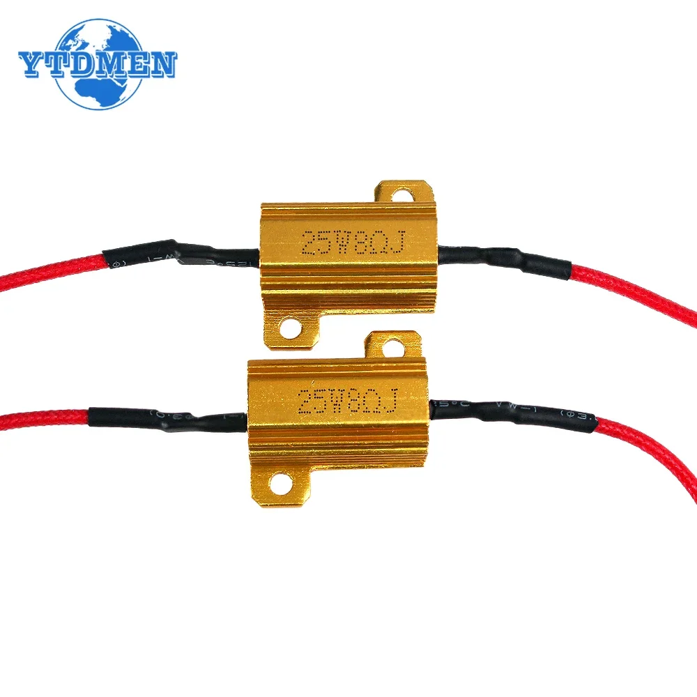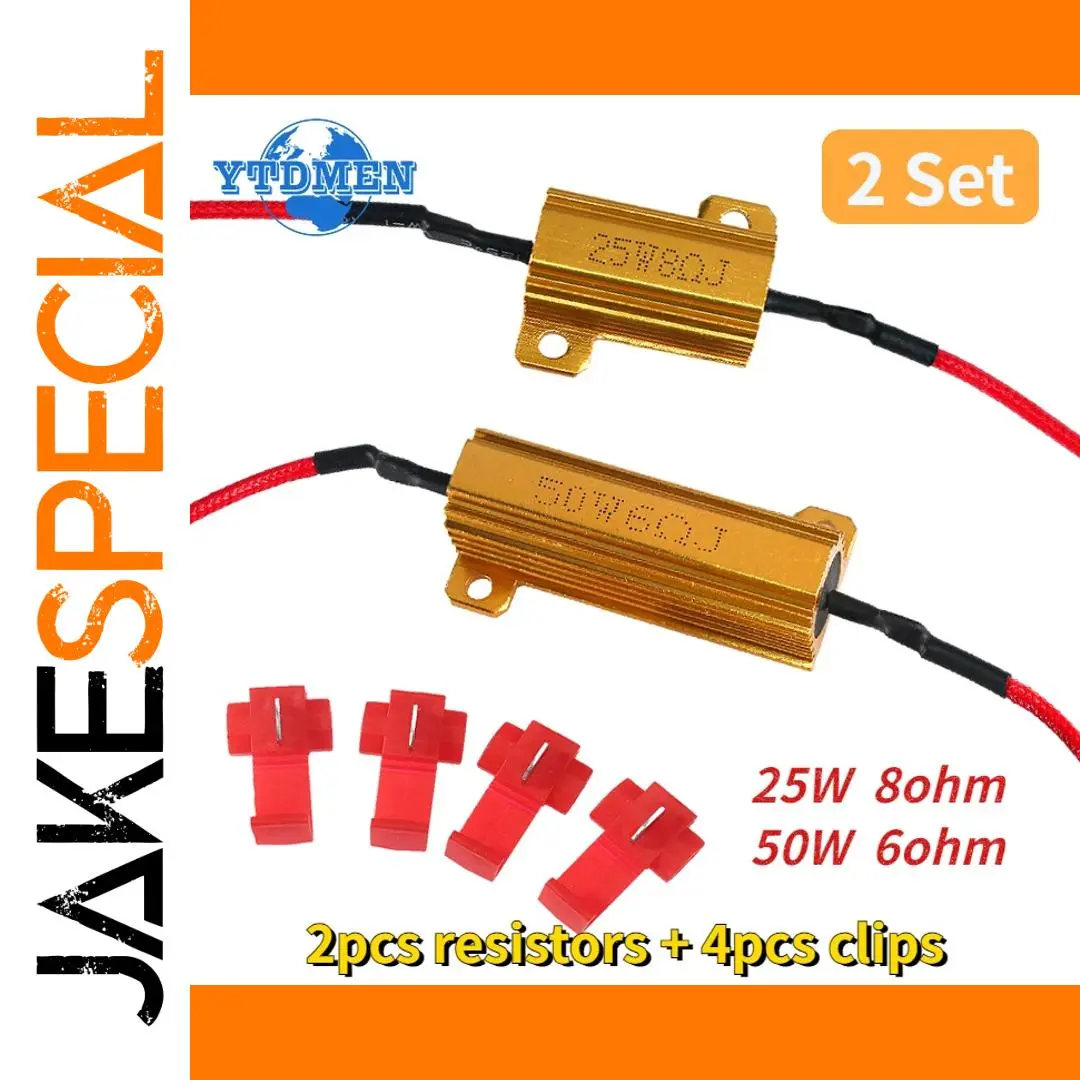 Enhance your automotive electrical system with this reliable set of two high-power aluminum shell resistors, including a 25W 8Ω resistor and a 50W 6Ω resistor, both designed for 12V systems. Featuring sleek wirewound construction and surface-mount design, these resistors offer exceptional stability, durability, waterproofing, and efficient heat dissipation. The sturdy aluminum casings have parallel grooves for optimal cooling, while the resistors’ compact form fits seamlessly into various car lighting and electronics applications. With a ±5% resistance tolerance and standard operating temperature range, this set ensures dependable performance for LED turn signals, brake lights, and other high-power automotive components, providing peace of mind with each installation.