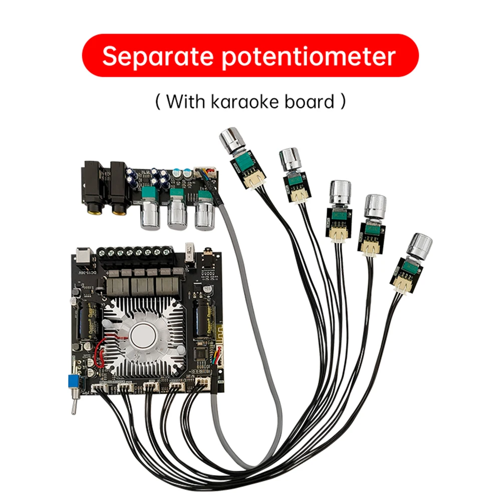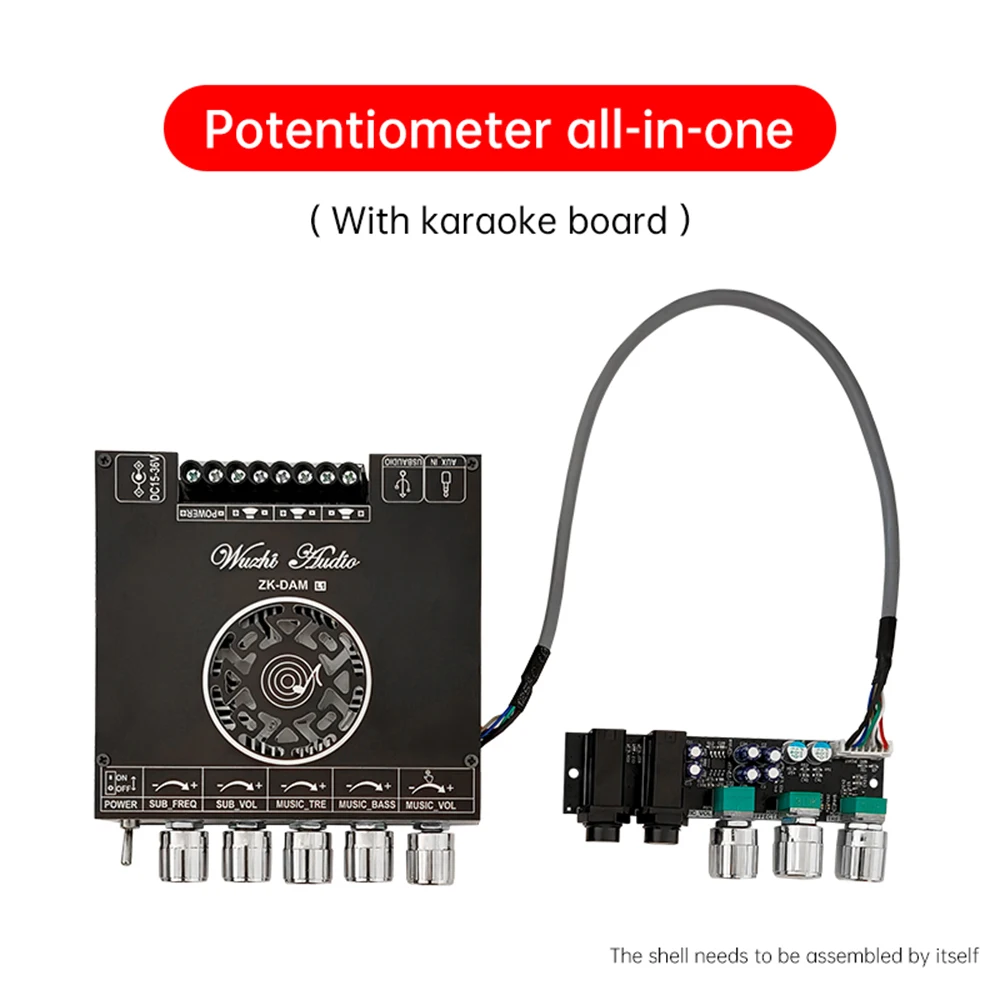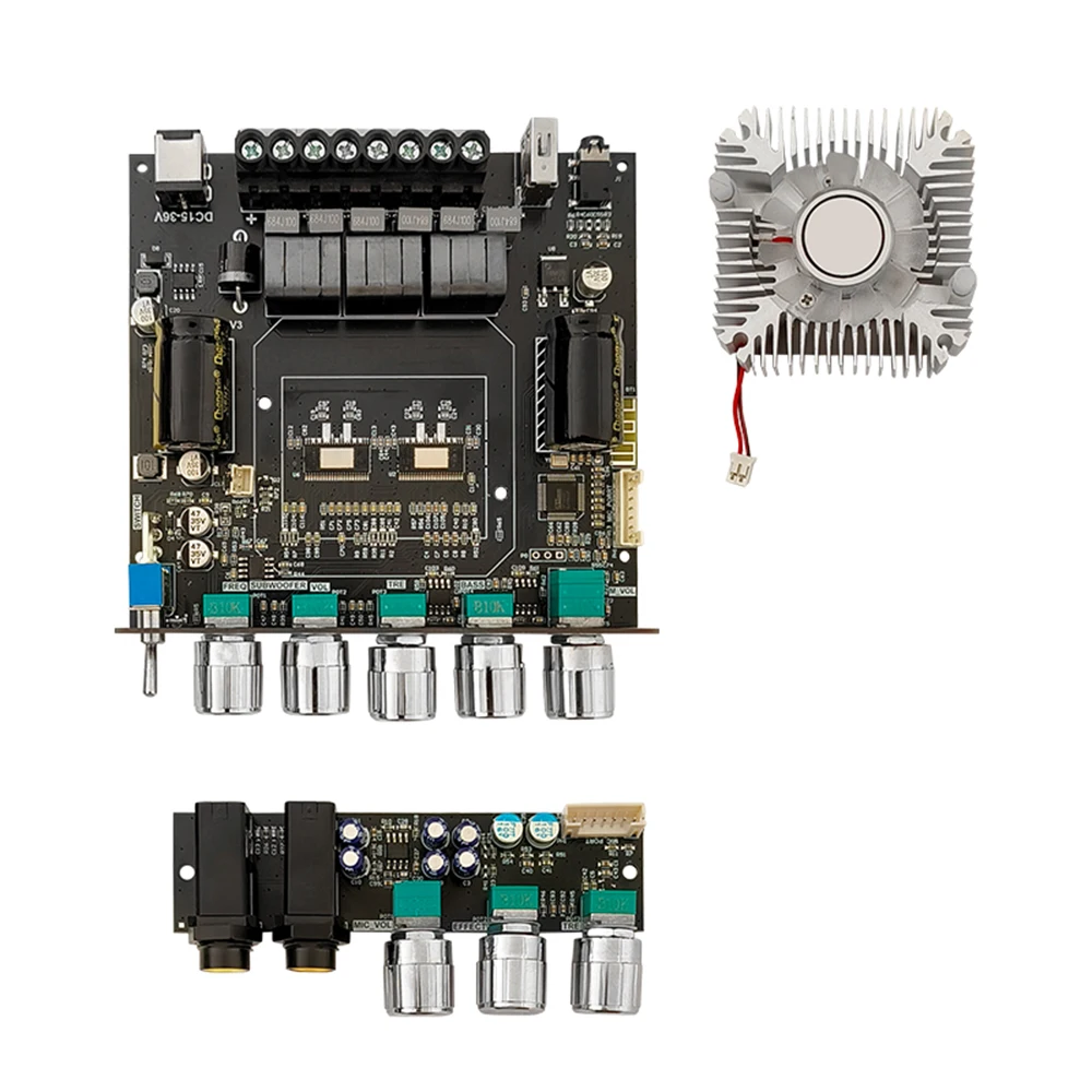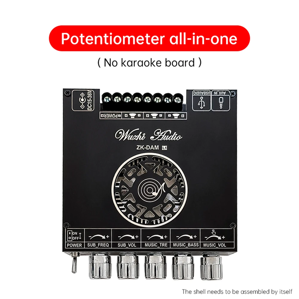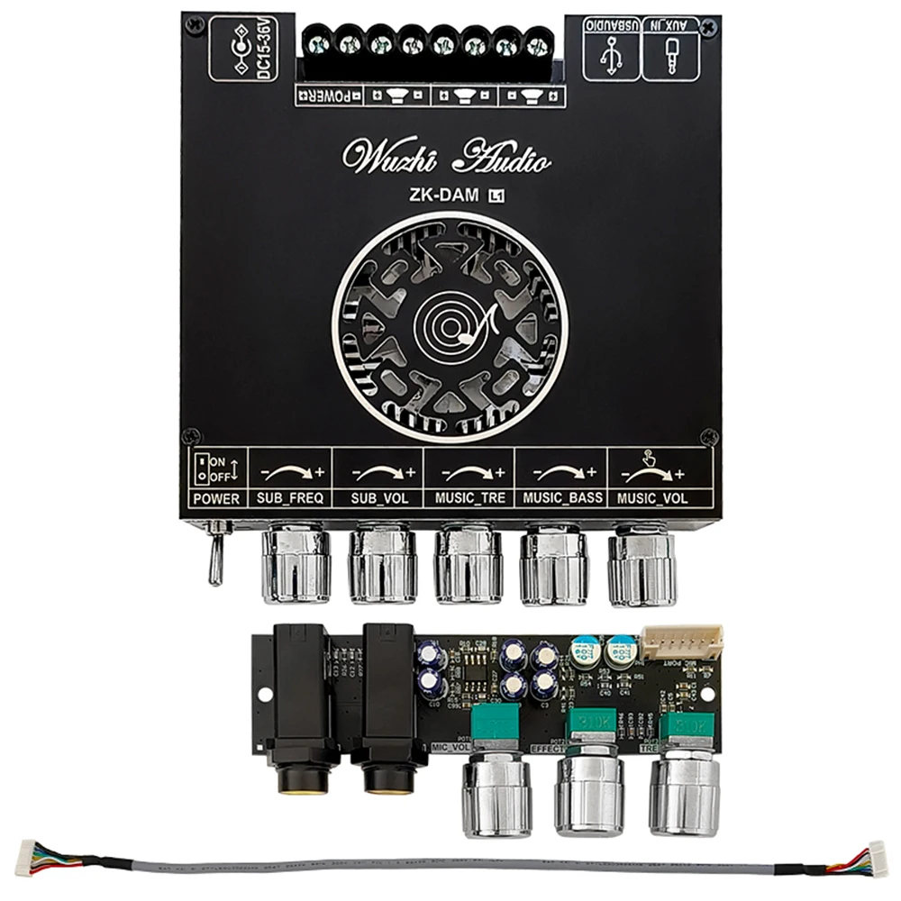 Experience high-quality audio amplification with the DC15-36V ZK-DAM L1 2.1 Channel Bluetooth Amplifier Board, featuring dual 220W outputs for left and right channels and a powerful 350W subwoofer channel, all driven by the TPA3251D2 chip. Supporting Bluetooth 5.0 with a 15-meter transmission range, it also accepts audio from AUX, USB flash drives (MP3, WAV, SBC, WMA, AAC, APE, FLAC), USB sound cards, and microphones, with EQ adjustment via computer. Operating on 15-36V DC power (≥8A), it is compatible with 50-200W, 3-8Ω speakers for main channels and 50-300W, 2-8Ω subwoofers. Compact and versatile, it features multiple protection mechanisms for reliable use.