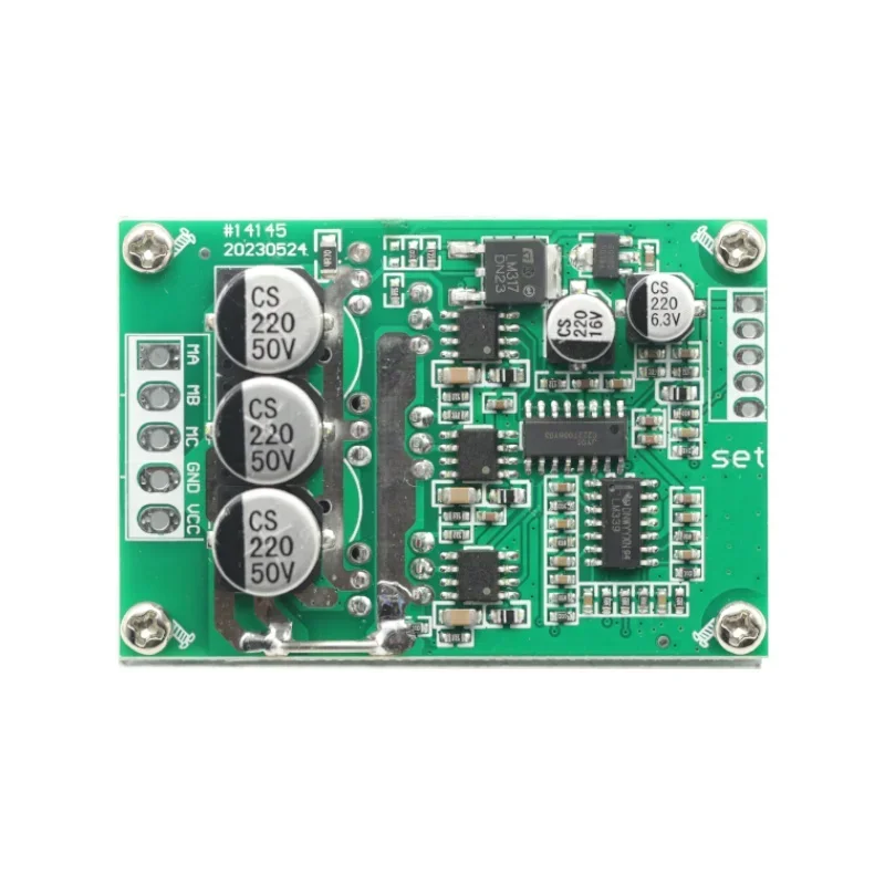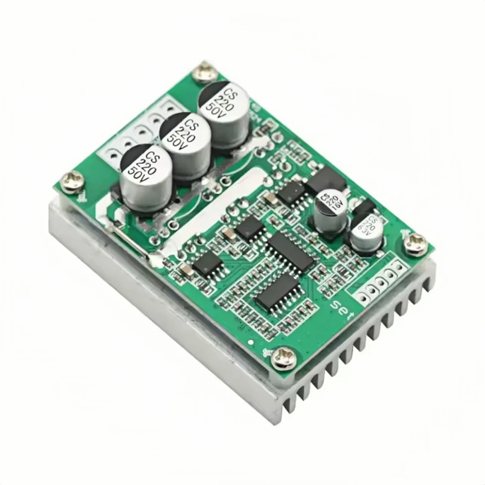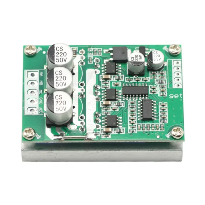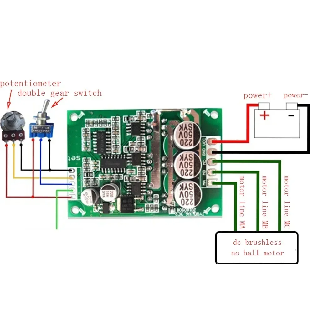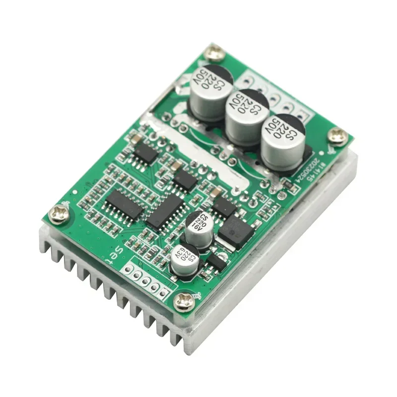 This high-power brushless motor driver module measures 65×45.4x35mm and is designed for DC supply voltages from 12V to 36V, delivering up to 500W of power. It supports a peak current of 10A and a continuous current of 15A, featuring an 18mm thick heatsink for effective heat dissipation. The module allows for both voltage-based and PWM speed regulation via a 5V control signal, with a potentiometer (10-50K) for manual adjustment or PWM control. It includes forward and reverse switching capabilities, with accessible screw terminals for wiring and connection. Proper wiring, grounding, and external cooling are essential for optimal operation and safety.
