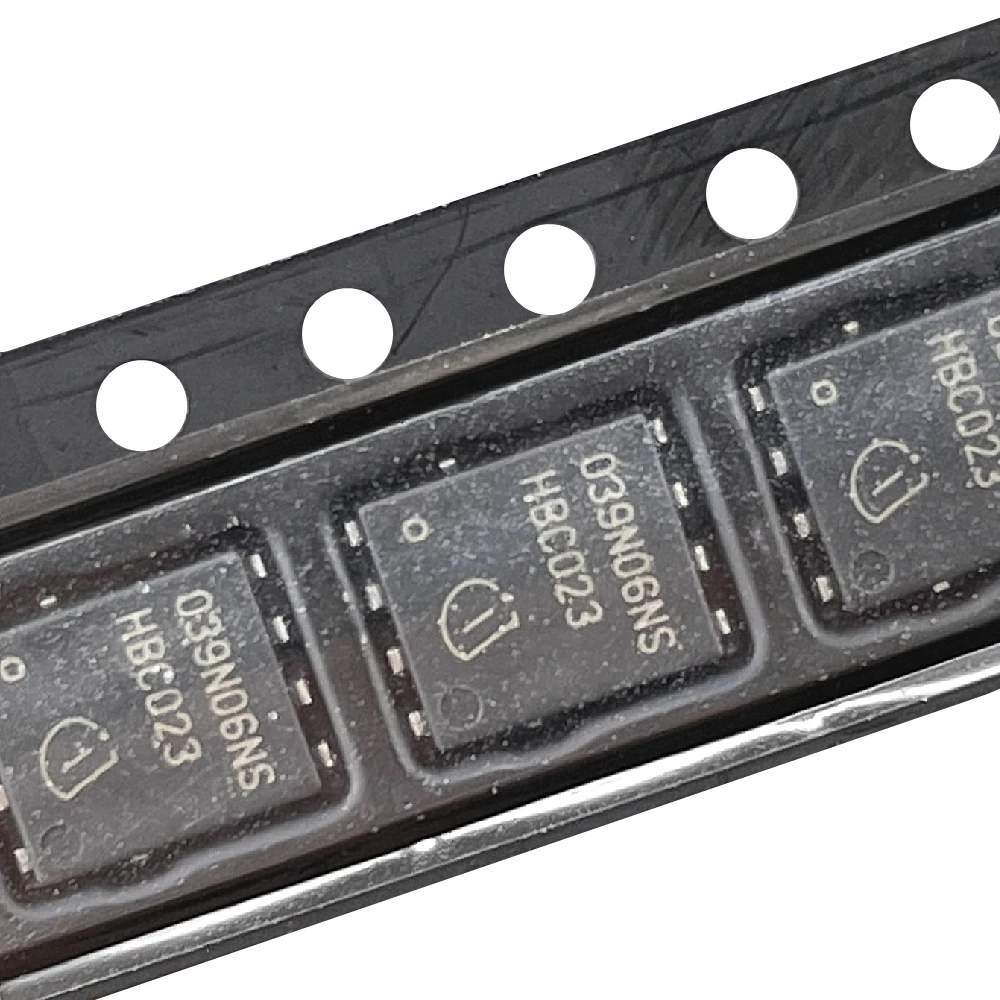 Experience seamless power management with this this high-current BSC039N06NS MOSFET, designed for demanding electronic applications. Crafted with a sleek, black DFN-8 surface-mount package, this component boasts an organized, modern aesthetic that reflects precision engineering. The white alphanumeric markings on each rectangular device enhance its high-tech appeal, while the evenly spaced perforations in the tape facilitate quick, accurate placement during automated assembly. With a robust build supporting up to 100A continuous drain current and a maximum voltage of 60V, this MOSFET ensures high efficiency and low internal resistance. Its clean, industrial style showcases reliable functionality, making it an essential component for high-power projects requiring stability, durability, and superior electric performance.