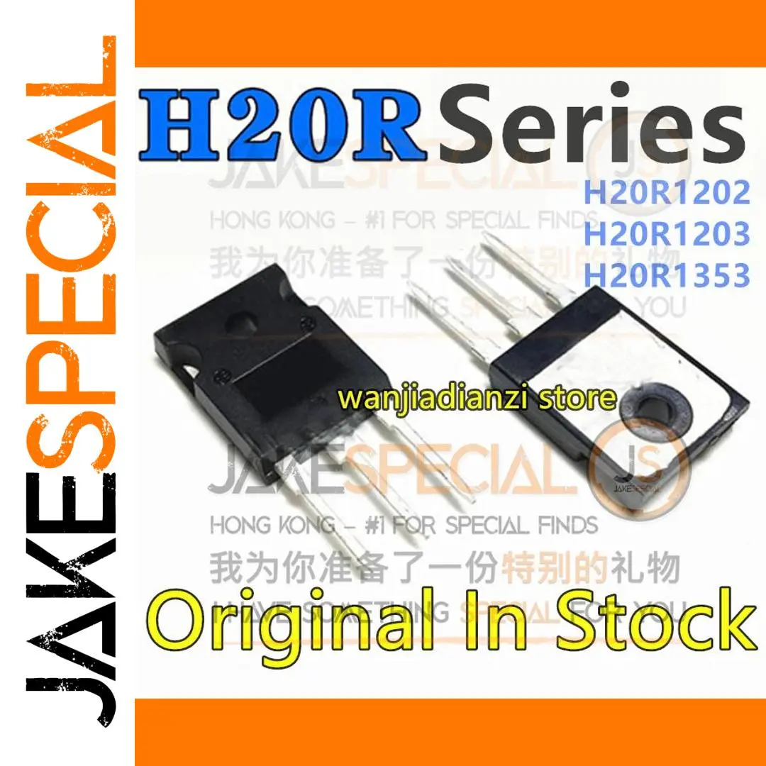 Experience reliable performance with these high-power IGBT transistors, including models H20R1202, H20R1203, and H20R1353, designed for induction cookers and electronic circuits requiring high current and voltage capacity. Featuring a sleek, matte black rectangular body with three metal leads extending downward for secure circuit integration, each transistor offers robust durability and precision. The H20R1353 variant is accented with a circular vent or marking for temperature regulation, highlighting its specialized design. Suitable for advanced power control applications, these new, original transistors ensure stable operation and long-lasting performance in demanding high-power environments.