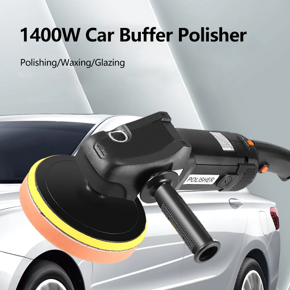 Experience professional-grade detailing with this powerful 1400W rotary buffer polisher. Its sleek black design features ergonomic textured grips, making handling comfortable and precise. The large, layered polishing pad with bright yellow outer ring, orange middle layer, and white inner section adds a vibrant visual appeal, emphasizing its versatility and efficiency. Perfect for removing scratches, swirls, and blemishes, this device is designed for both automotive and household use. Its adjustable speed range from 600 to 3600 RPM ensures you can tailor performance for various materials, from delicate painted surfaces to tougher surfaces like metal and ceramic. Lightweight yet durable, this tool transforms your polishing routines, helping you achieve a flawless shine with confidence and ease, whether you're a professional or an enthusiastic DIYer.