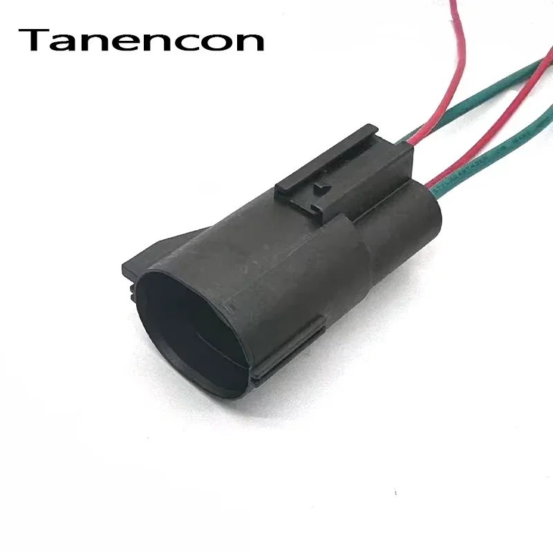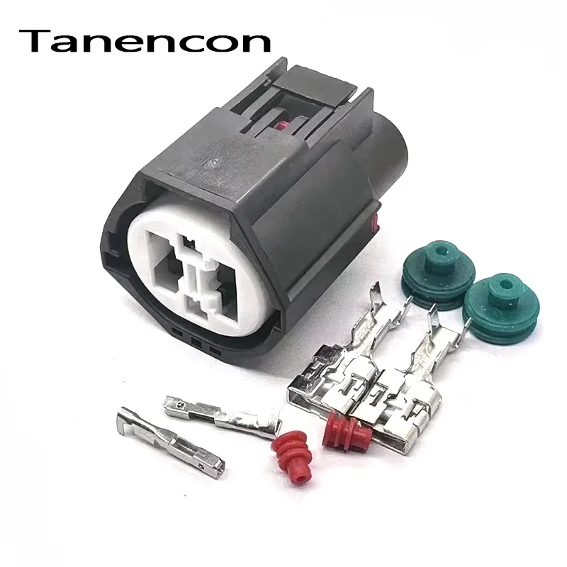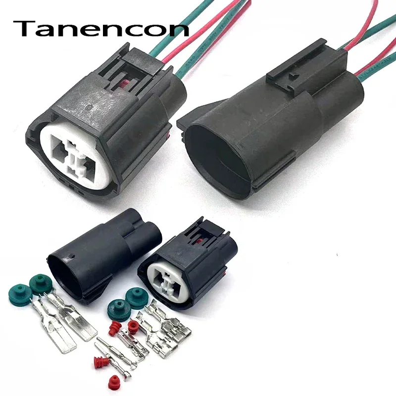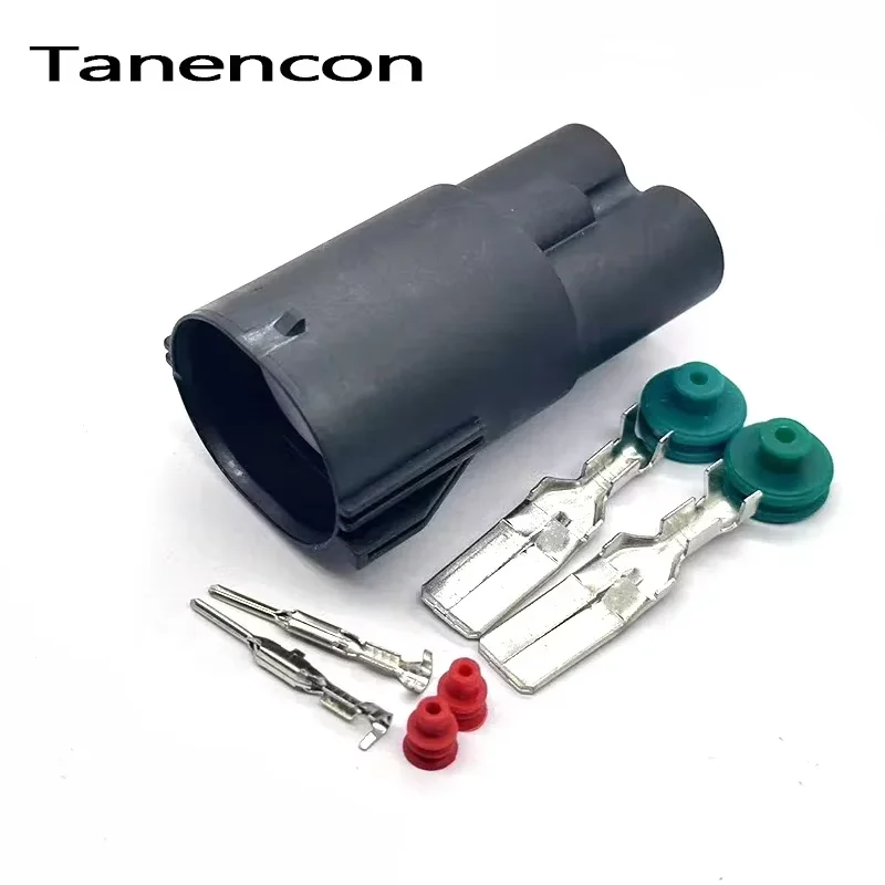 Imagine upgrading your vehicle's radiator fan connection with this durable and reliable waterproof connector set. Designed for high-power automotive applications, this kit features a sleek black plastic housing with smooth, rounded edges and rectangular contours, giving it a modern, functional look. Inside, a contrasting white female socket ensures a secure fit, while vibrant green rubber seals add a splash of color and guarantee waterproof protection. Silver-toned metal terminals provide a shiny, industrial finish, crimped tightly onto wires for stable electrical conductivity. Small red clips or spacers help align and secure components within the housing, ensuring effortless installation and longevity. This set offers peace of mind through its durable construction, designed to withstand harsh automotive environments and deliver dependable performance. Perfect for dedicated car enthusiasts seeking a flawless electrical connection.