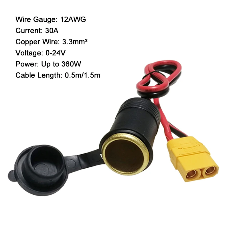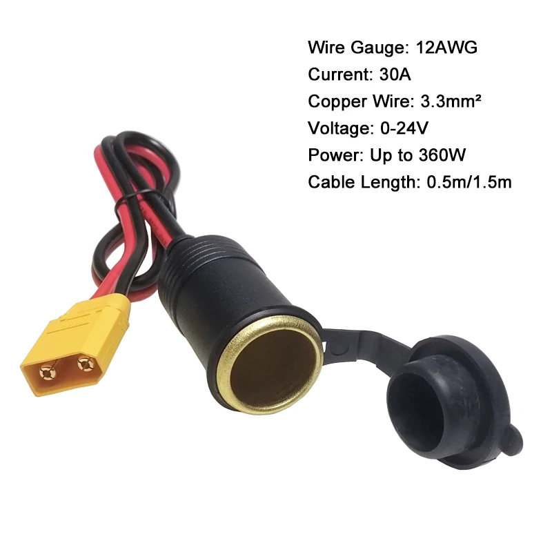This high-power 30A DC cable features an XT90 male and female connector, along with a pure copper cigarette lighter female connector made from 3.3 square millimeters of copper wire. Available in 0.5m or 1.5m lengths, it supports voltages up to 24V and delivers a maximum power of 360W. The cable is equipped with 12 AWG or 16 AWG wires, suitable for high-current applications involving cigarette lighter and XT90 connectors. Designed for durability and reliable power transfer, this cable is ideal for demanding electrical setups where secure, high-quality connections are essential, providing optimal performance without voltage conversion.