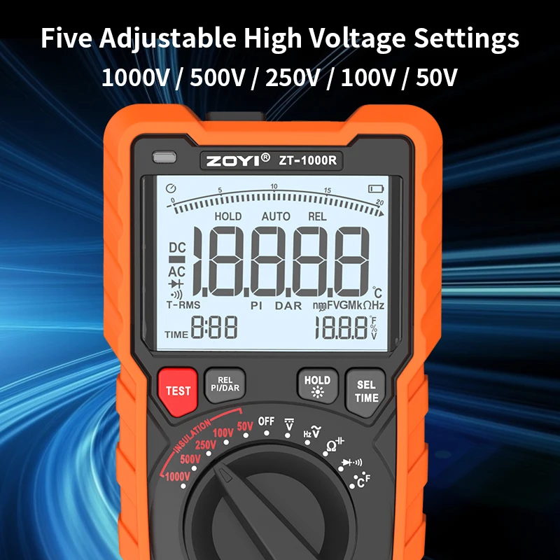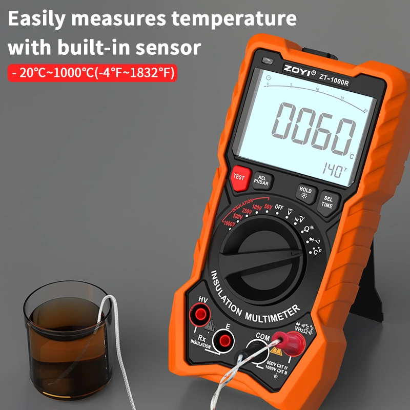 Experience precise electrical testing with this high-quality digital multimeter featuring automatic range functionality. It measures DC voltage up to 1000V and AC voltage up to 750V, making it ideal for a variety of electrical applications. The rugged orange protective casing with textured grip enhances durability and handling, while the large digital display ensures clear readings. The centrally located control dial allows easy selection of measurement modes, including voltage, resistance, and continuity testing. Designed for professionals, this multifunctional multimeter is perfect for troubleshooting, maintenance, and testing tasks, providing reliable performance in a robust, industrial-style design.