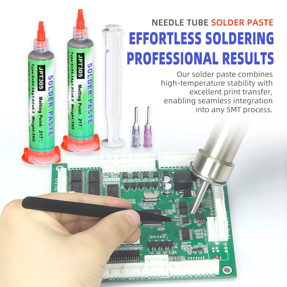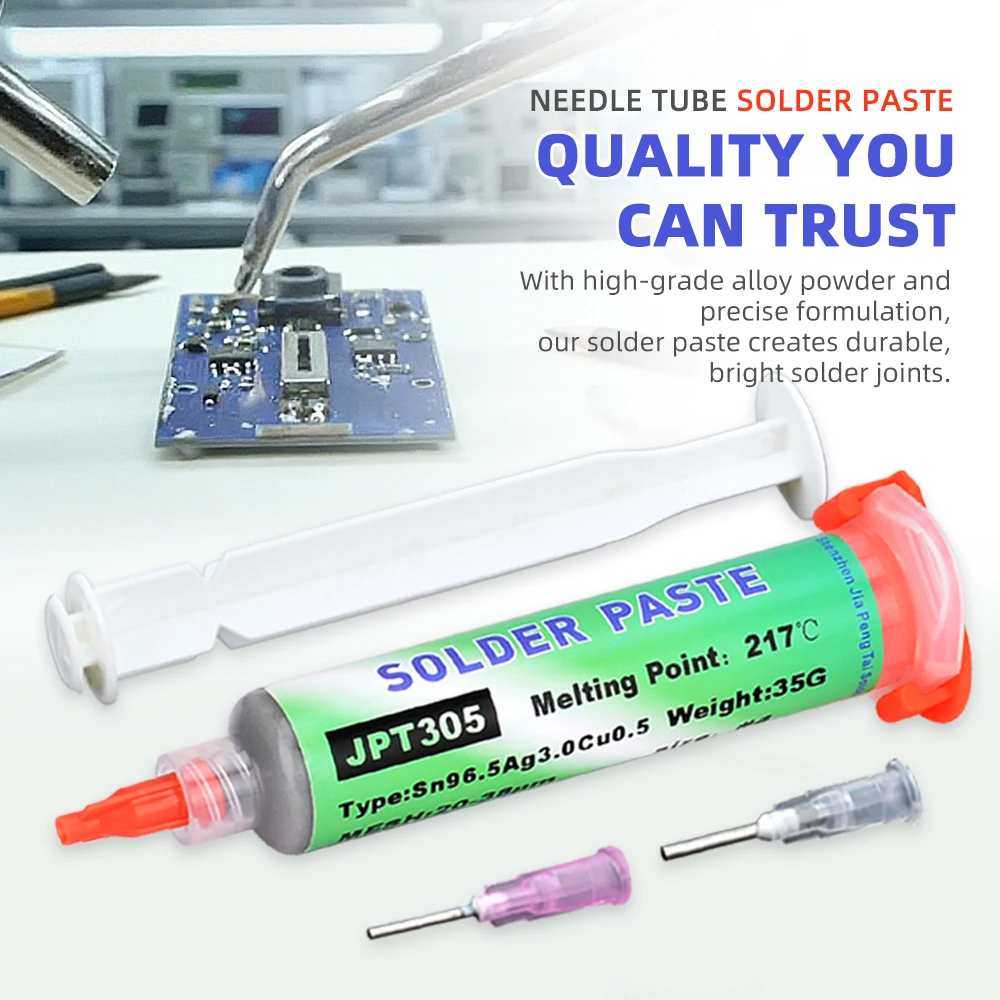- Technical specifications: lead-free alloy composition, particle size 20-38μm, melting point 217°C, available in multiple weights—15g, 20g, 30g, 35g, 50g—crafted for high-precision electronics work.