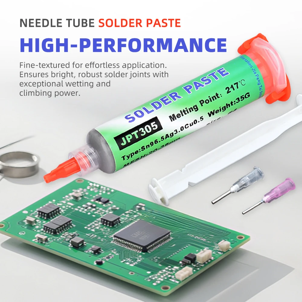 Experience the confidence of professional-quality soldering with this high-performance, lead-free solder paste. Its sleek syringe-style tube ensures precise application, perfect for PCB, BGA, and SMD repairs. The vibrant green body contrasts with the white label, highlighting key specifications like the melting point of 217°C and particle size of 20-38μm, making it clear that this product is designed for meticulous electronic work. The bright orange nozzle cap features ergonomic control for accurate soldering, whether you're repairing USB sockets or assembling intricate circuit boards. Its modern, utilitarian design exudes reliability, inspiring trust in your repair or assembly process. Perfect for enthusiasts and professionals seeking high precision, this solder paste seamlessly blends functionality with technical excellence, elevating your craftsmanship.
