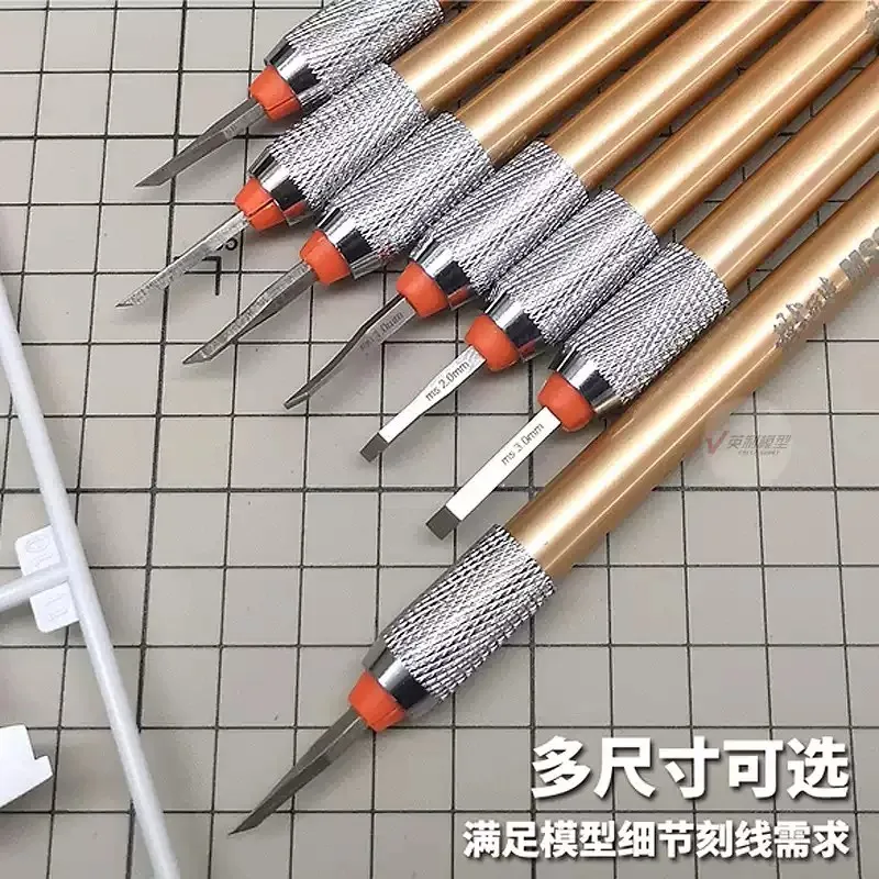Discover the precision and craftsmanship of this high-quality set of eight metal carving chisels, designed specifically for hobbyists and model enthusiasts. Featuring tip sizes from as fine as 0.15mm up to 3.0mm, these tools allow detailed engraving and scoring on metal surfaces, perfect for military model building, miniature details, or intricate crafts. The sleek, metallic finish combined with textured, knurled handles ensures a comfortable grip and precise control during your projects. The set’s professional appearance highlights its high-grade materials, while the included red safety cap emphasizes safety when not in use. Whether you’re touching up a detail or creating new effects, this set elevates your craftsmanship to a new level, making detailed work more effortless and enjoyable.