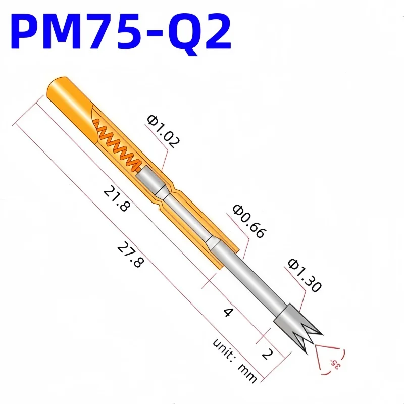 Experience reliable and efficient electrical testing with this set of PM75-Q2 spring test probes. Designed with a sleek metallic finish, these probes feature a modern, minimalist style that combines durability with style. The polished, reflective surface makes them easy to handle while delivering precise contact during testing. The two-tone design, with a gold-colored shaft and a silver tip, adds a visual touch of sophistication. With a length of 28.7mm and a pin diameter of 1.02mm, these probes are ideal for DIY electronic projects or professional testing setups. The 4-claw silver head ensures secure, stable contact with components, providing long-lasting performance. Perfect for anyone seeking accuracy and quality in their testing tools.