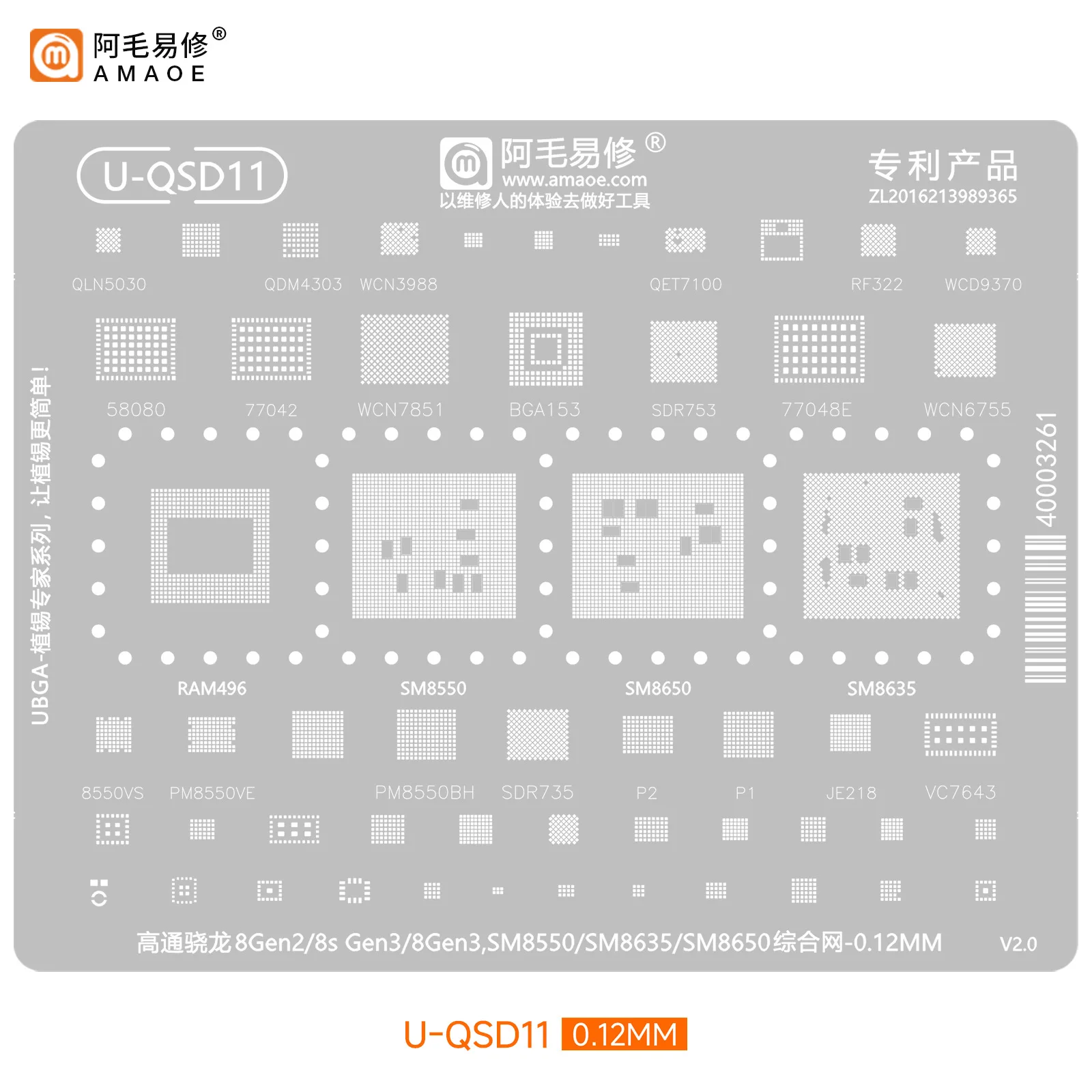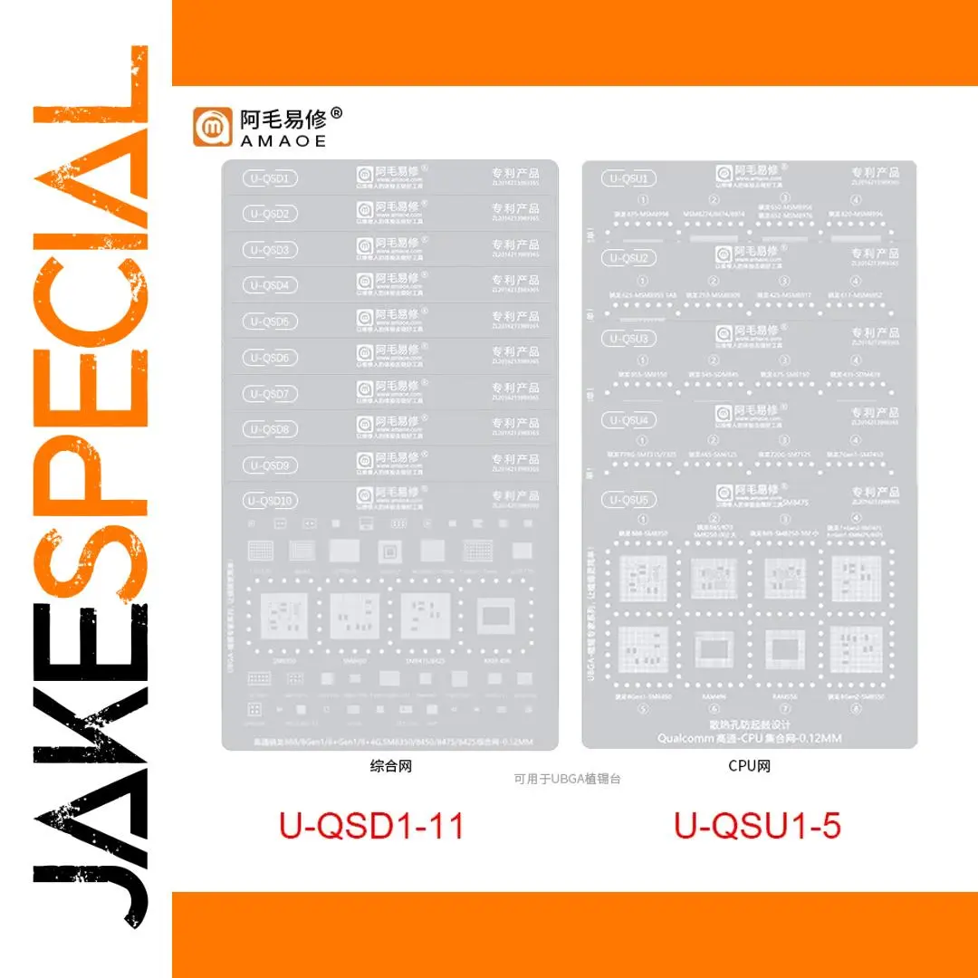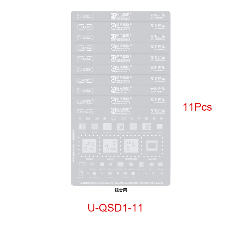 Experience the ultimate in electronic repair with this this high-precision BGA reballing stencil designed specifically for Qualcomm Snapdragon CPUs. Crafted with a thickness of just 0.12mm, it ensures unparalleled accuracy for professional reballing and rework processes. The stencil’s crisp, clean geometric patterns and organized layout allow for effortless alignment and precise solder ball placement. Available in various models and configurations, including U-QSD1, U-QSD11, U-QSU1, and more, it suits a wide range of Snapdragon chips like 888, 870, 8Gen2, 680, and Snapdragon series SM7250, SM7350, SM8350, among others. Its minimalistic, technical aesthetic—featuring white lines on a light gray background—supports a highly organized workflow for reliable, quality repairs.