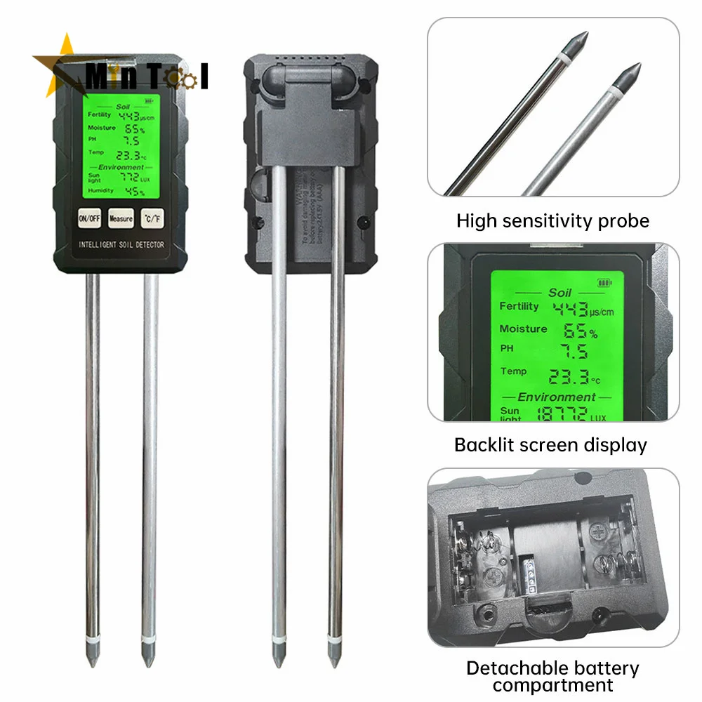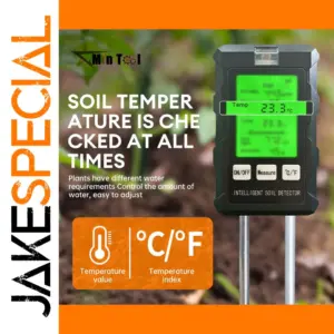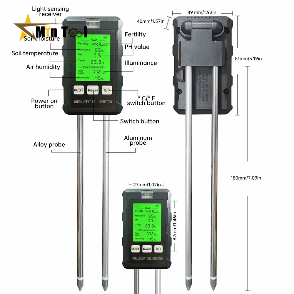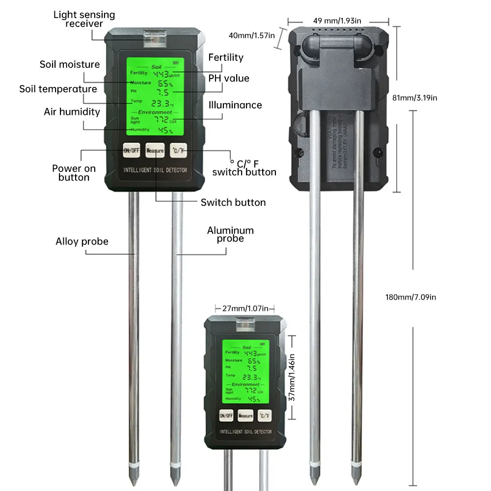 Experience precise soil analysis with this high-accuracy soil detector, featuring a sleek black design and a high-definition backlight screen that displays illumination, humidity, pH, and temperature simultaneously. Equipped with a highly sensitive probe, it provides quick, reliable test results in just 3 seconds. The dual temperature unit switchable between ℃ and ℉ allows versatile temperature readings. Perfect for garden and greenhouse use, it helps monitor soil fertility and nutrient levels to promote healthy plant growth. Powered by two AAA batteries (not included), this rugged and modern device combines functionality and durability to support your gardening and agricultural needs.